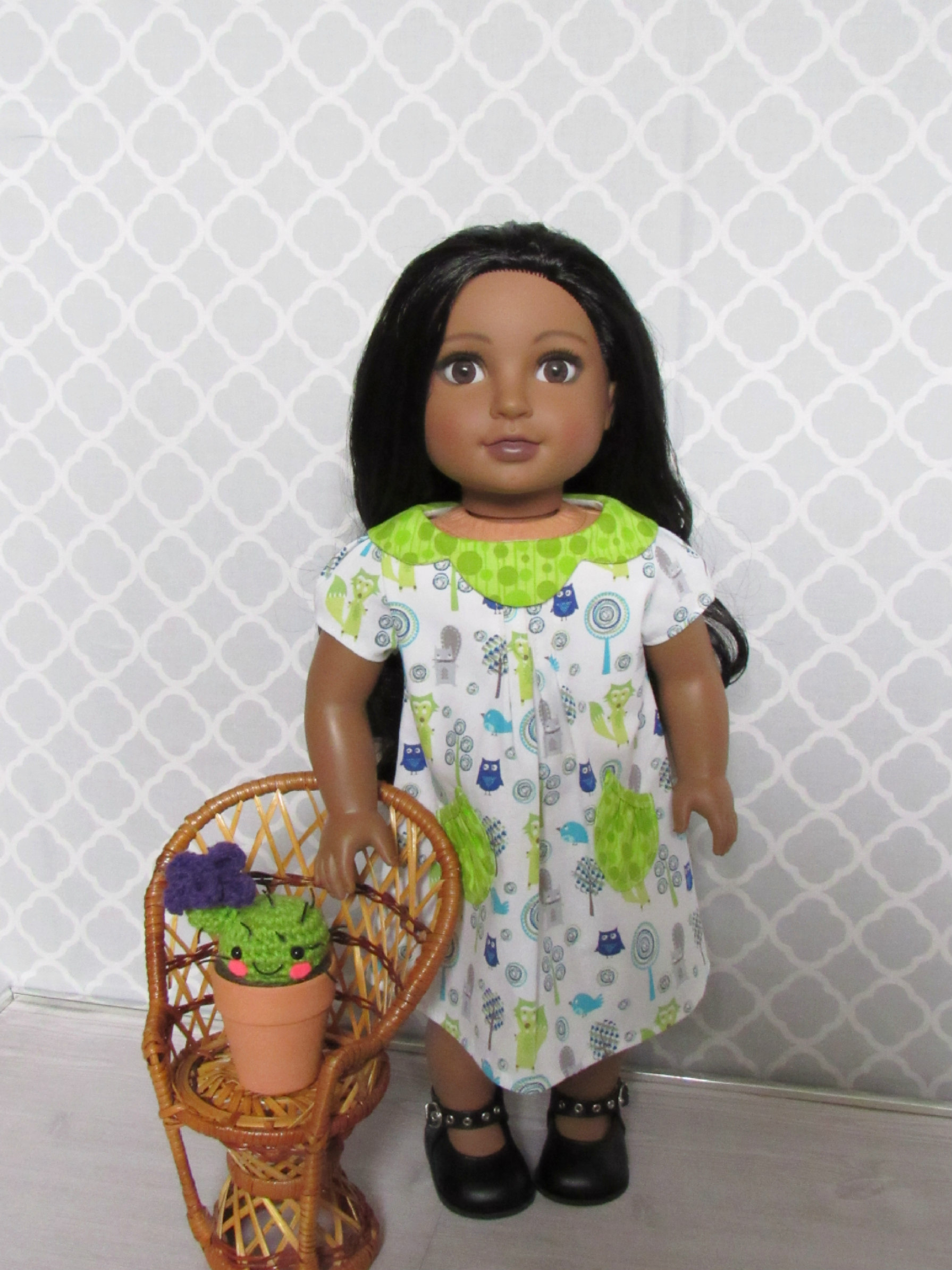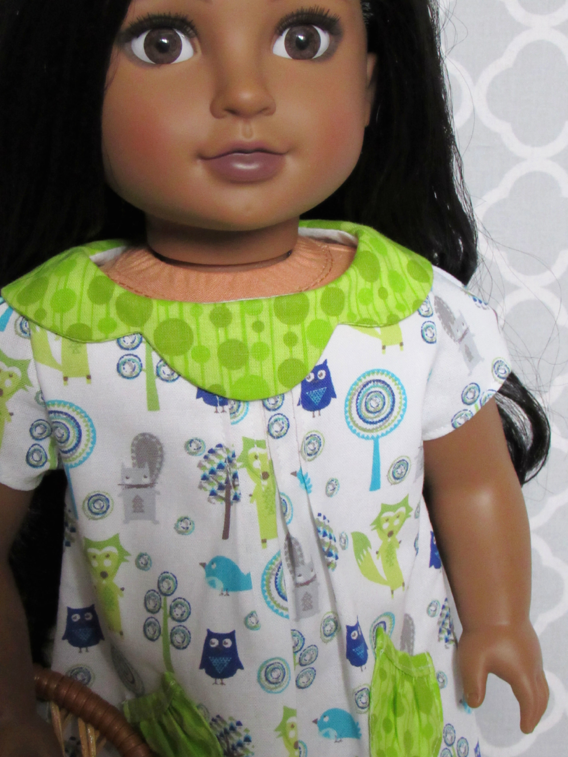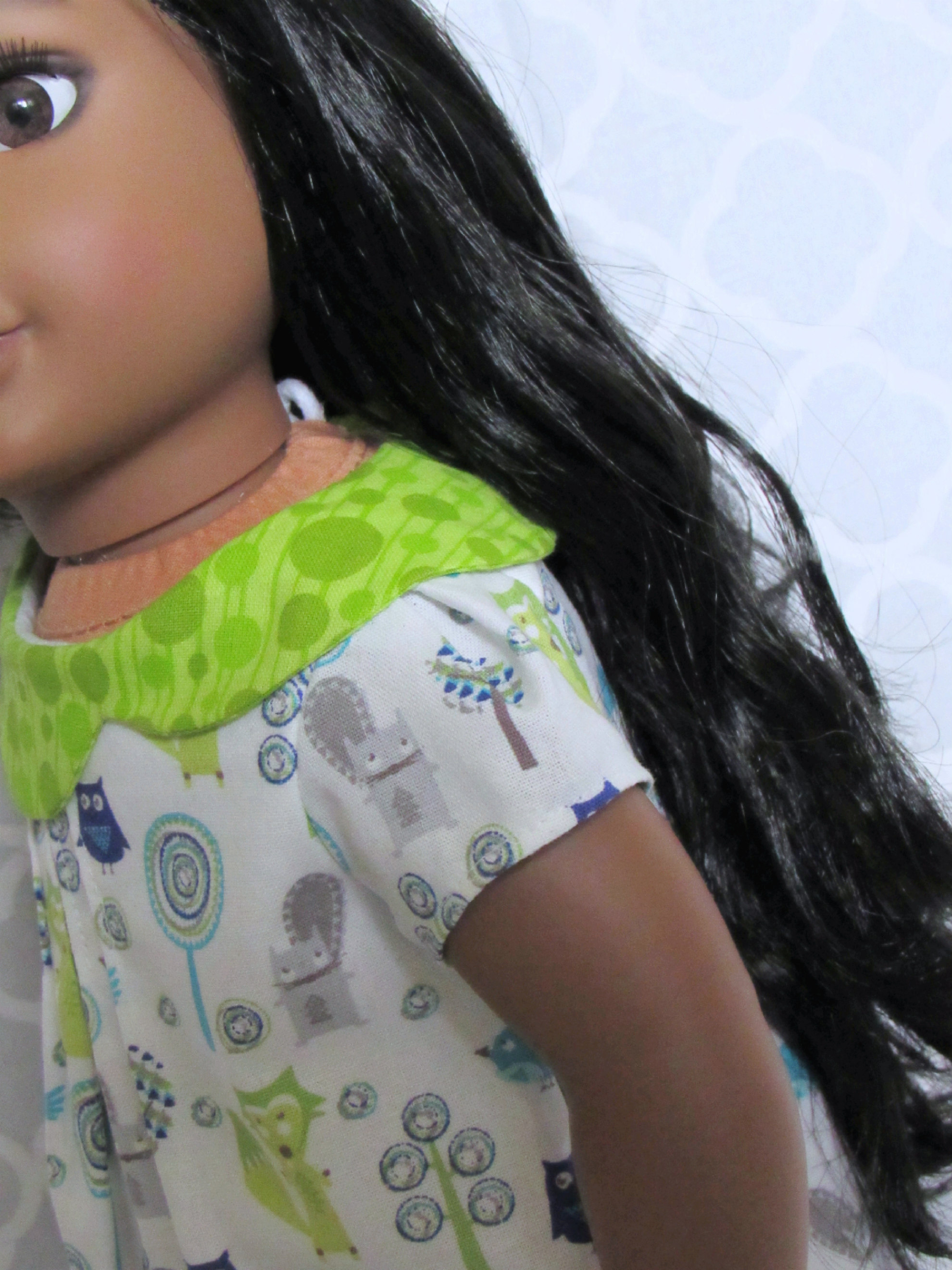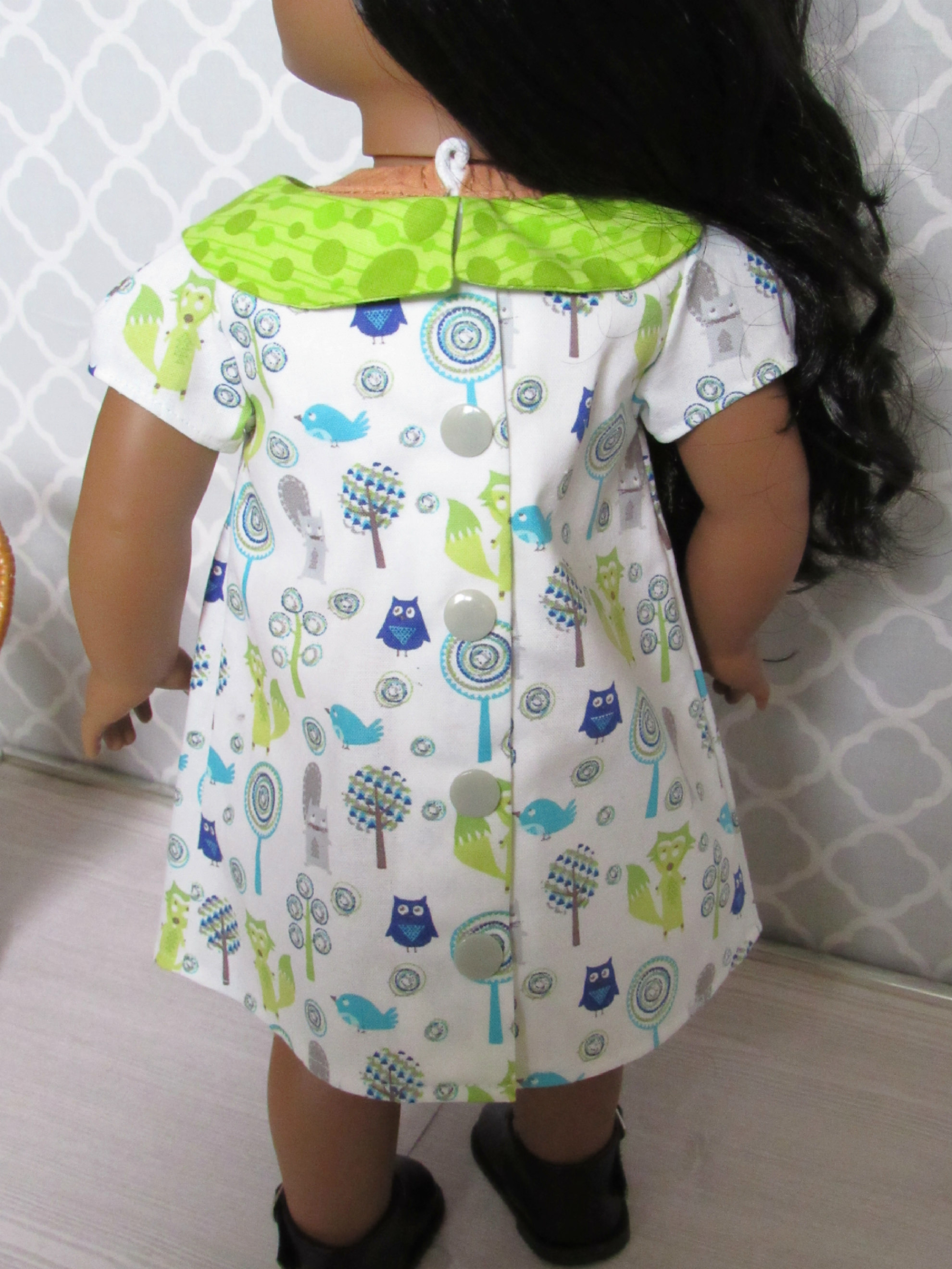 Cute and colorful woodland animal print dress with bright leaf green petal collar and gathered pocket accents. Light gray snap closures in the back. Pleats on front and both sleeves. Dress only. Doll, props, and shoes not included. Handmade from an Avery Lane pattern.