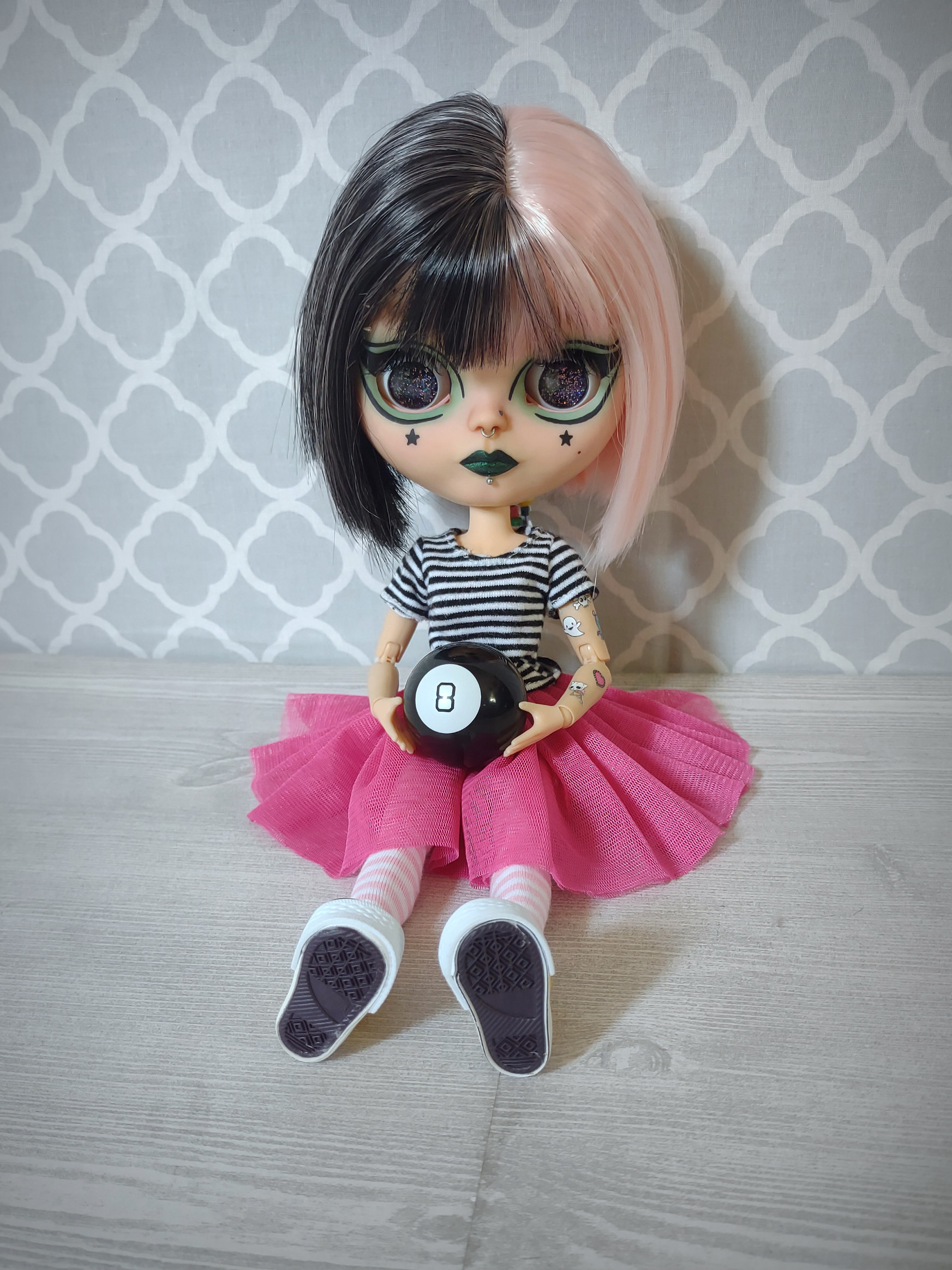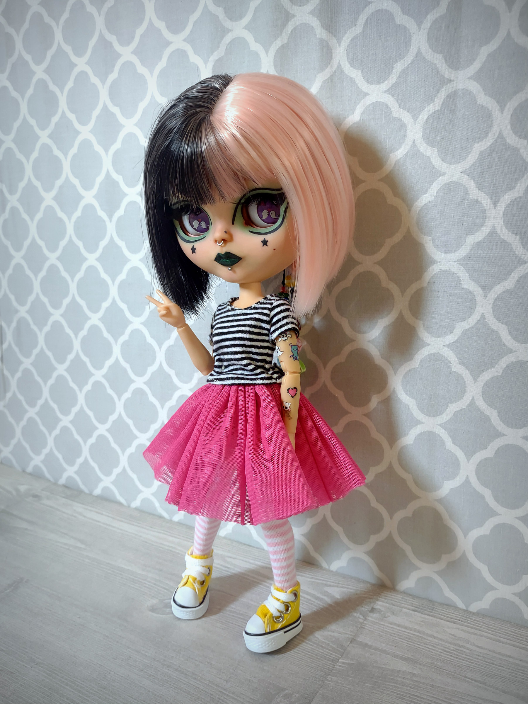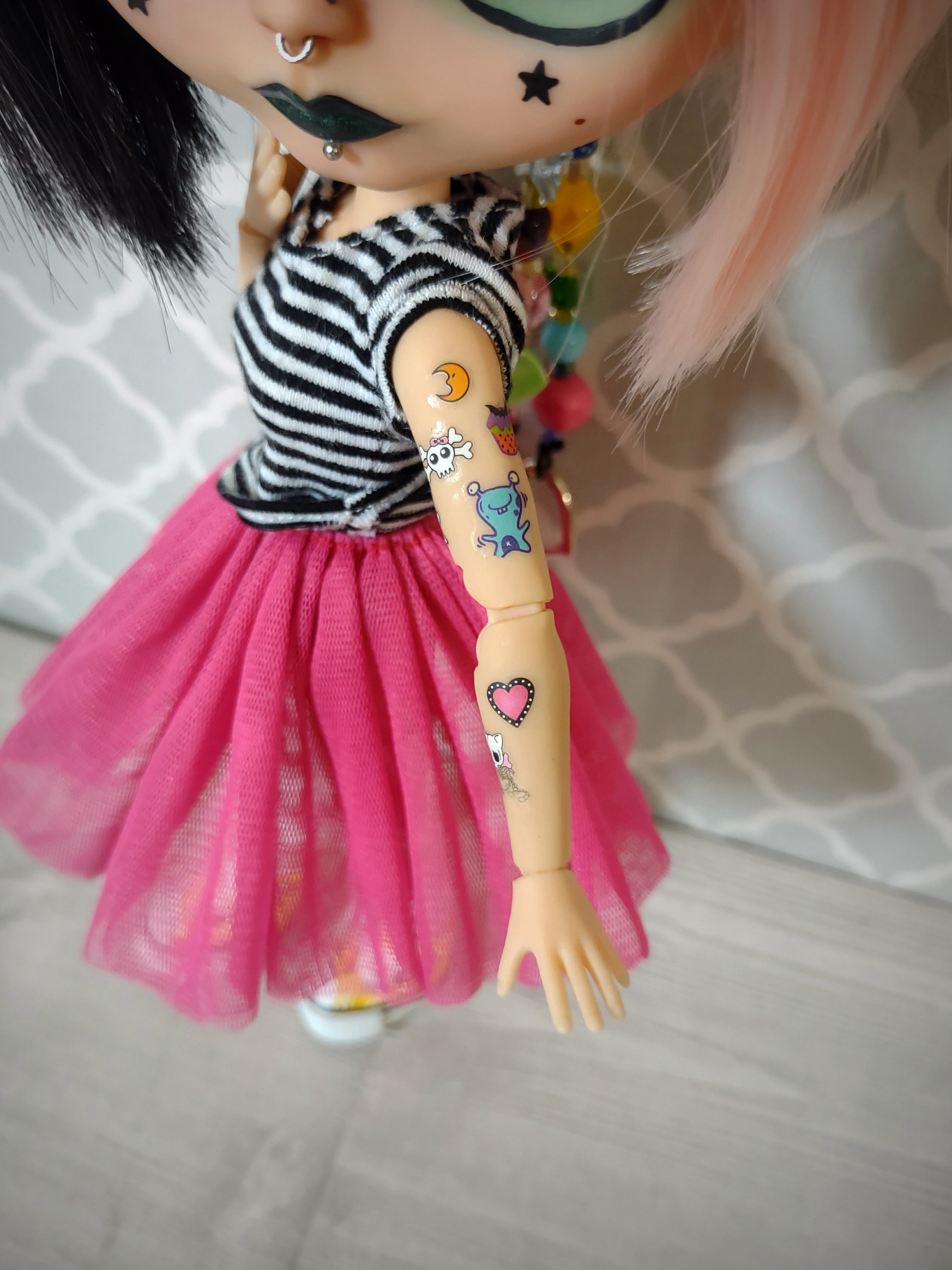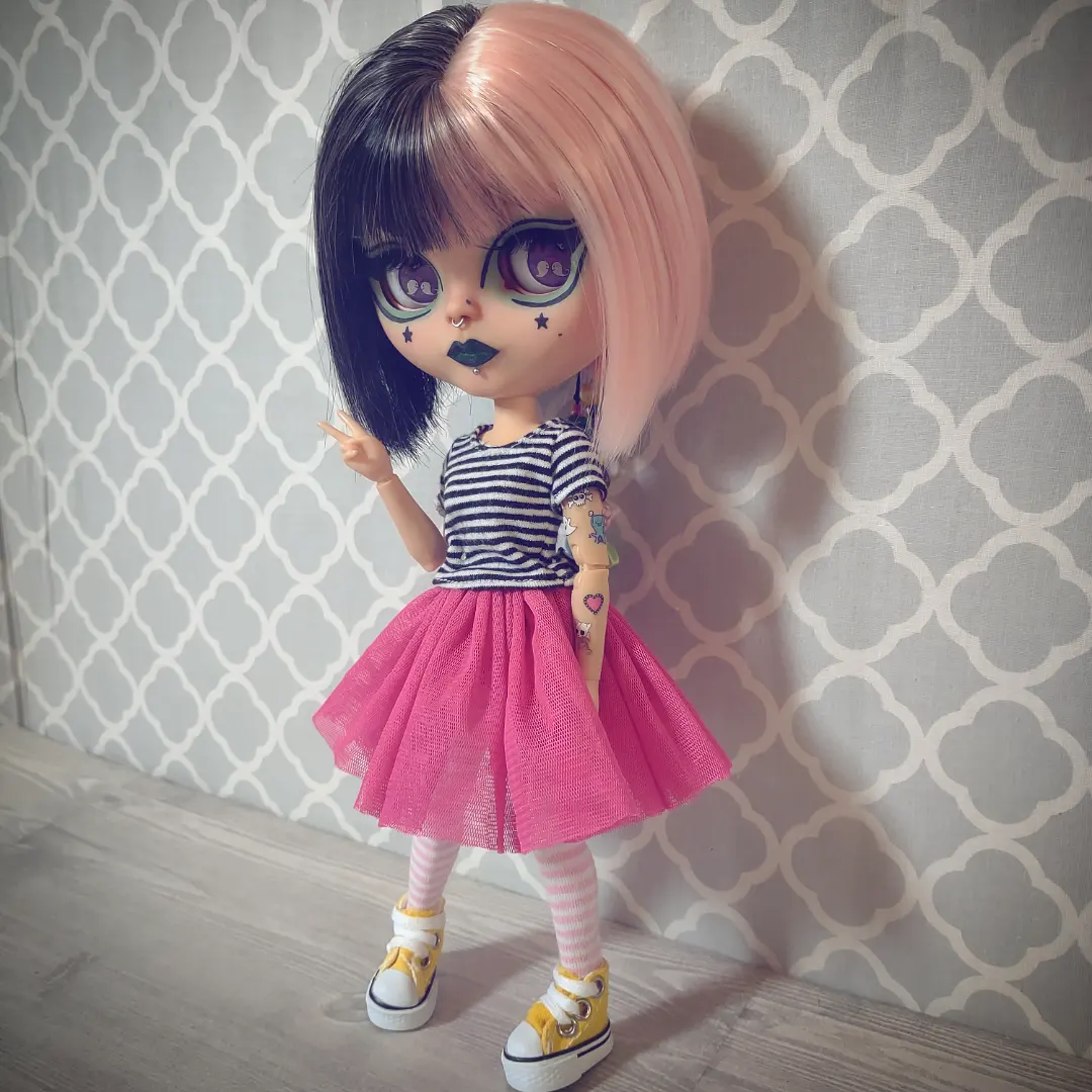 She is an authentic Ashton Drake Blythe base on an articulated body. Her hair is a black and pastel pink split dyed wig. Her wig is not glued but fits securely on her head with the help of a silicone wig cap. She has 4 pair of custom eye chips including one pair of resin chips from BeBe Blythe Co, and three pair of glass eye chips handmade by me. Her lids and back plate are also painted, and she has two custom beaded pull strings. Her tattoos are sealed against gentle wear, but please be cautious of them when changing her clothes.