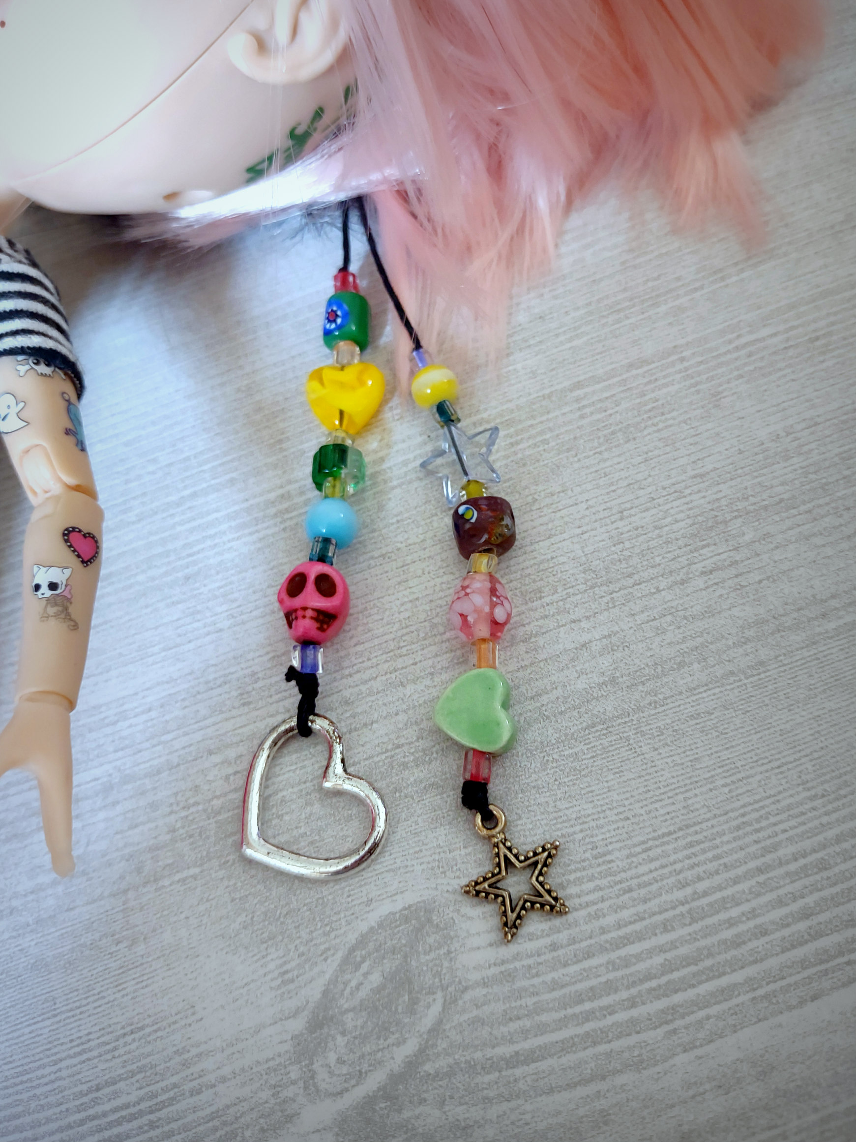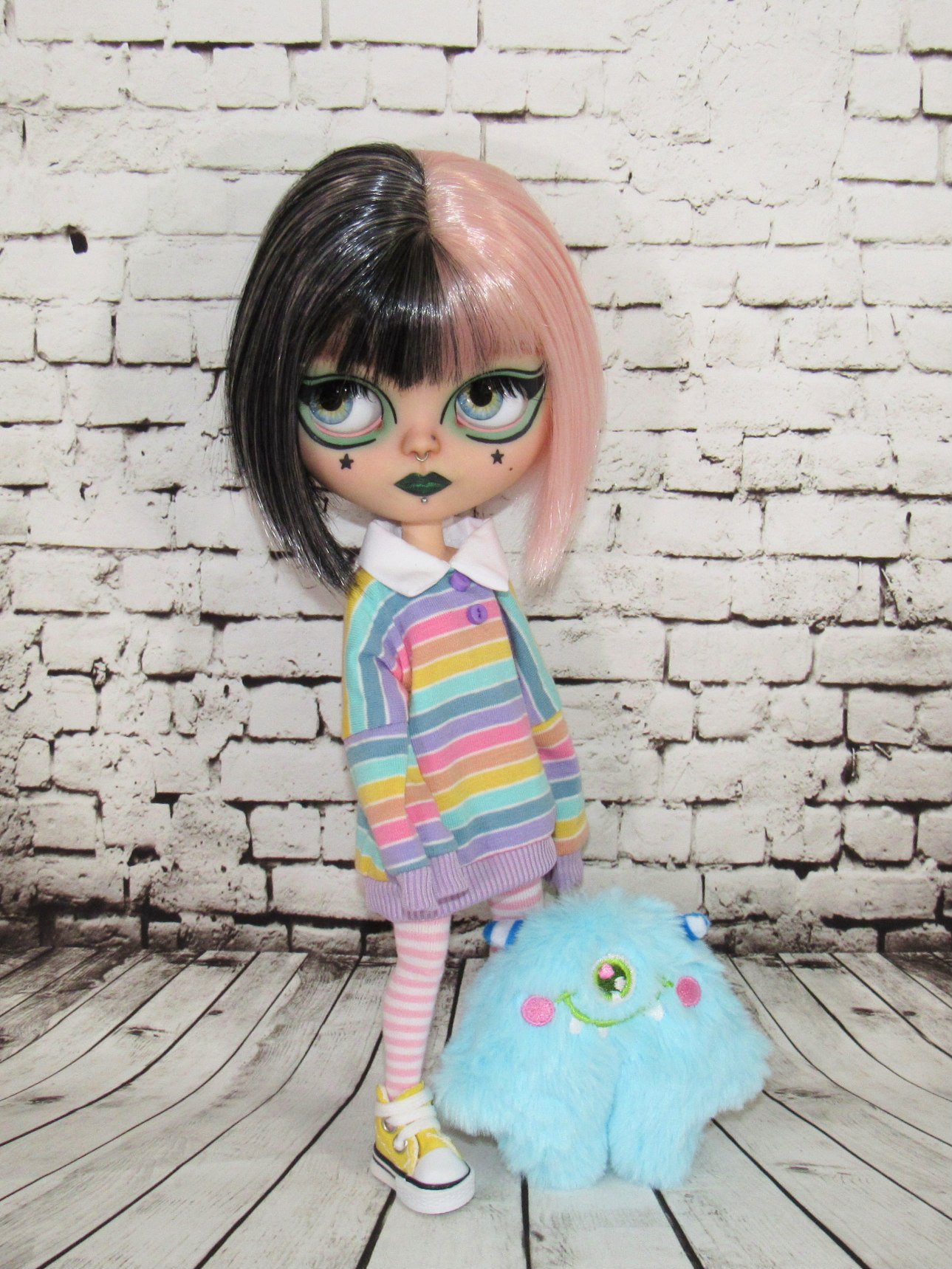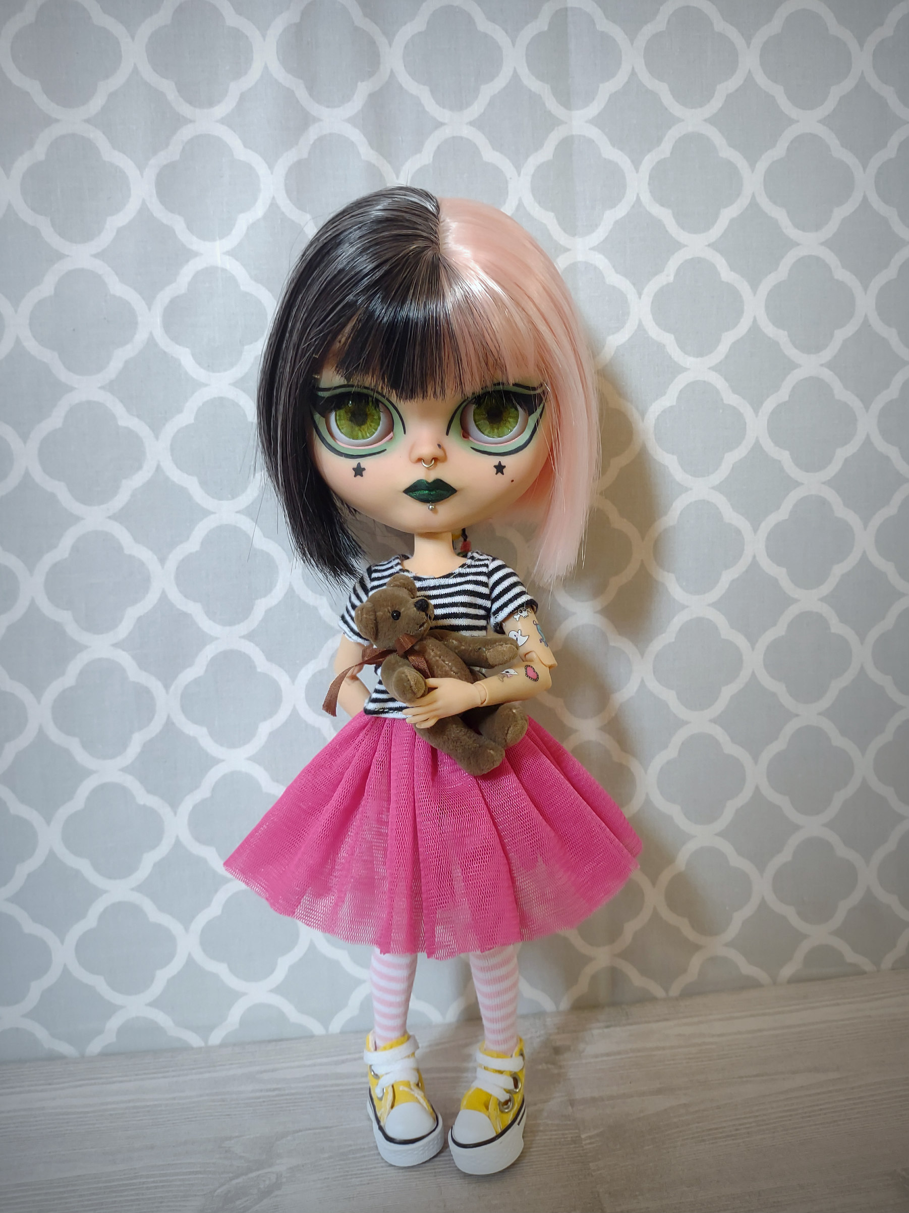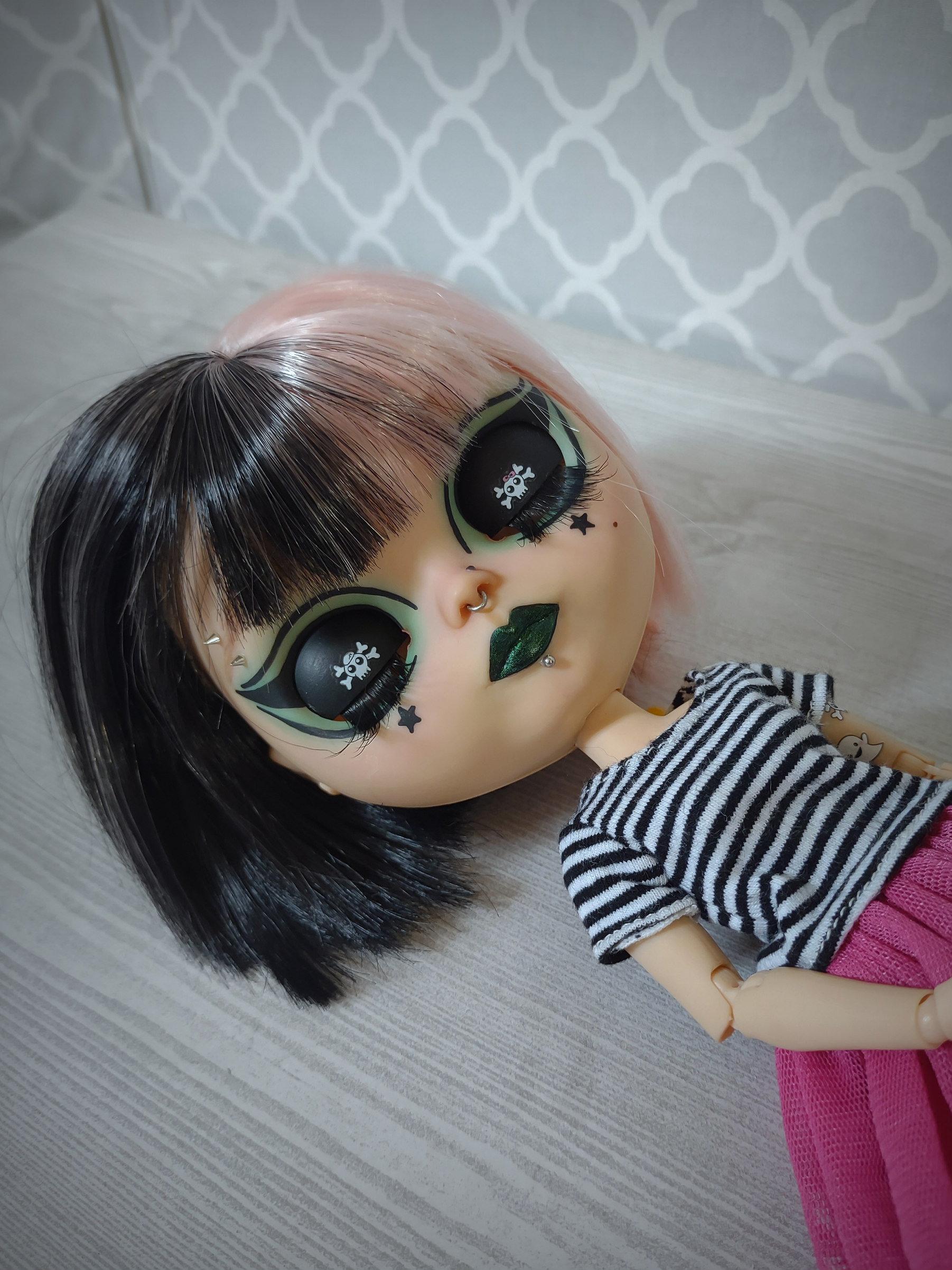 She is an authentic Ashton Drake Blythe base on an articulated body. Her hair is a black and pastel pink split dyed wig. Her wig is not glued but fits securely on her head with the help of a silicone wig cap. She has 4 pair of custom eye chips including one pair of resin chips from BeBe Blythe Co, and three pair of glass eye chips handmade by me. Her lids and back plate are also painted, and she has two custom beaded pull strings. Her tattoos are sealed against gentle wear, but please be cautious of them when changing her clothes.