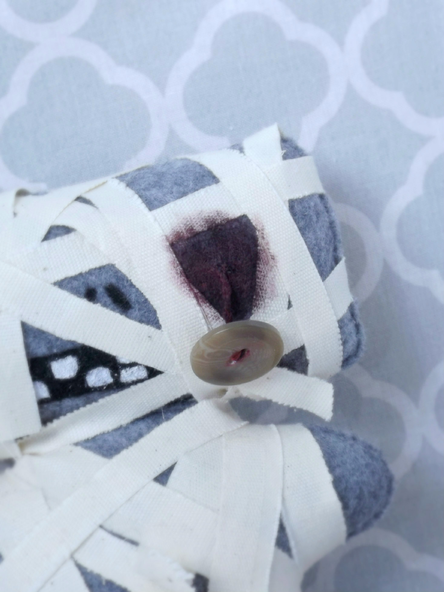 This shambling mummy Blockhead is made with eco felt made from recycled plastic bottles and painted with fabric paint and acrylics. He has one dangling button eye, and his remains are held together with soft muslin bandages.