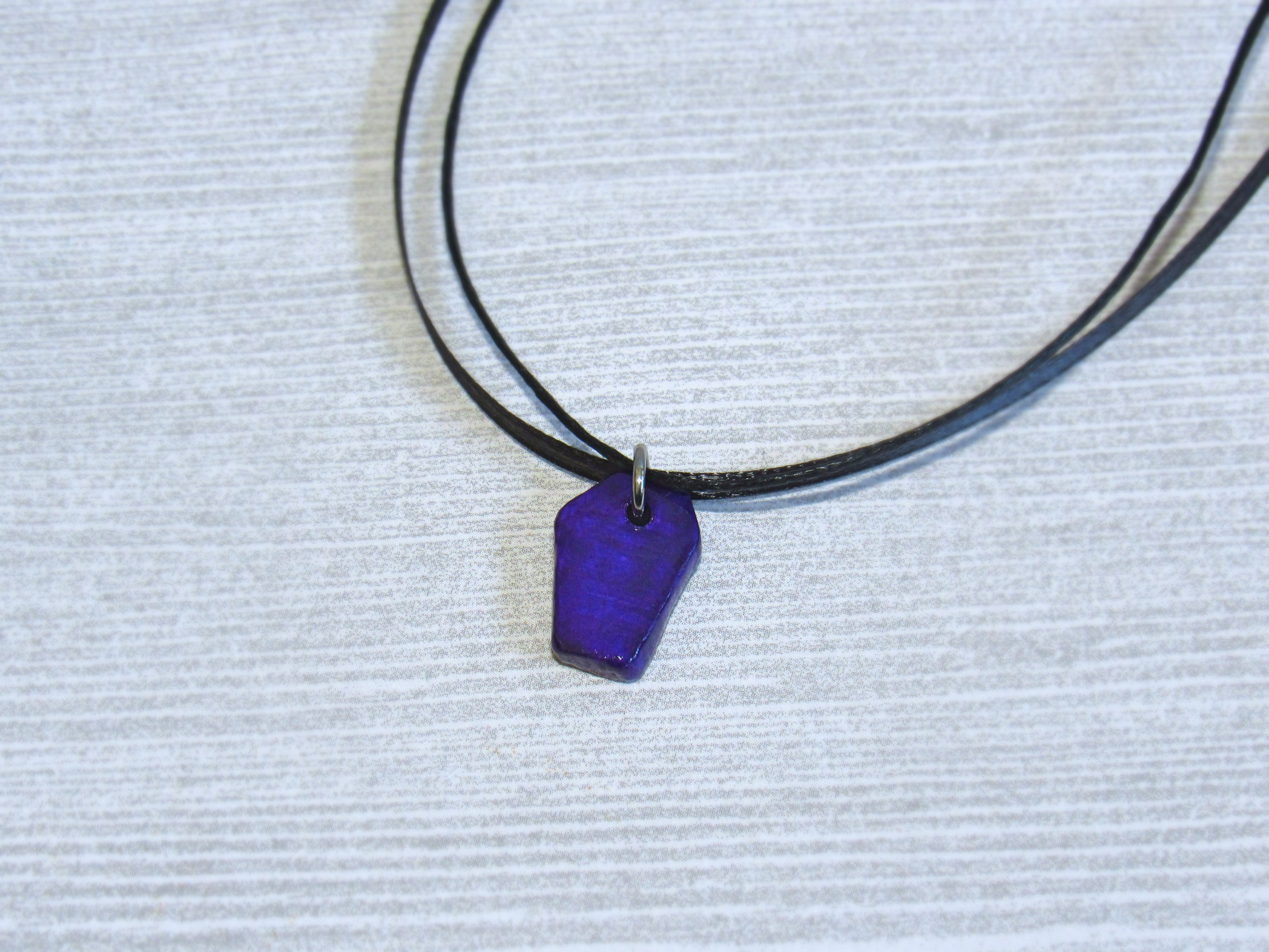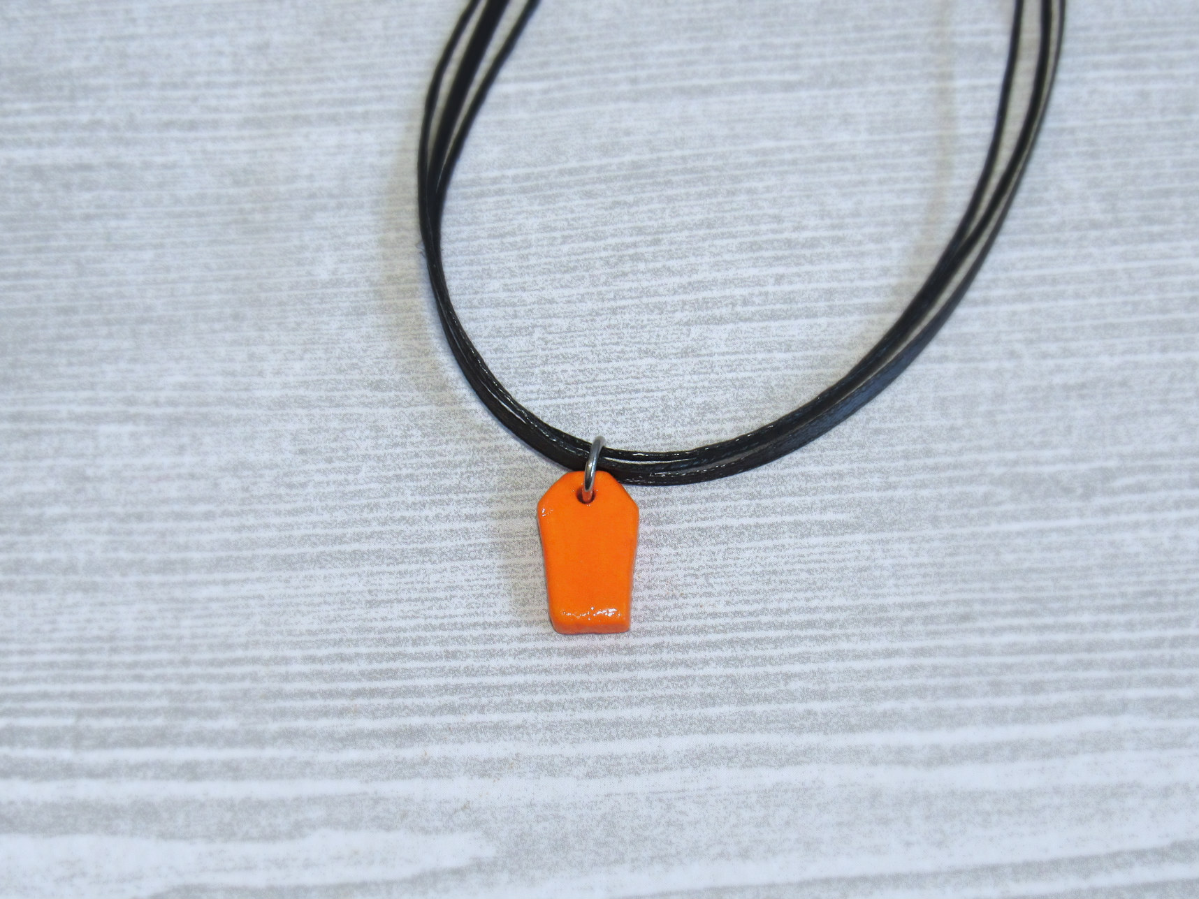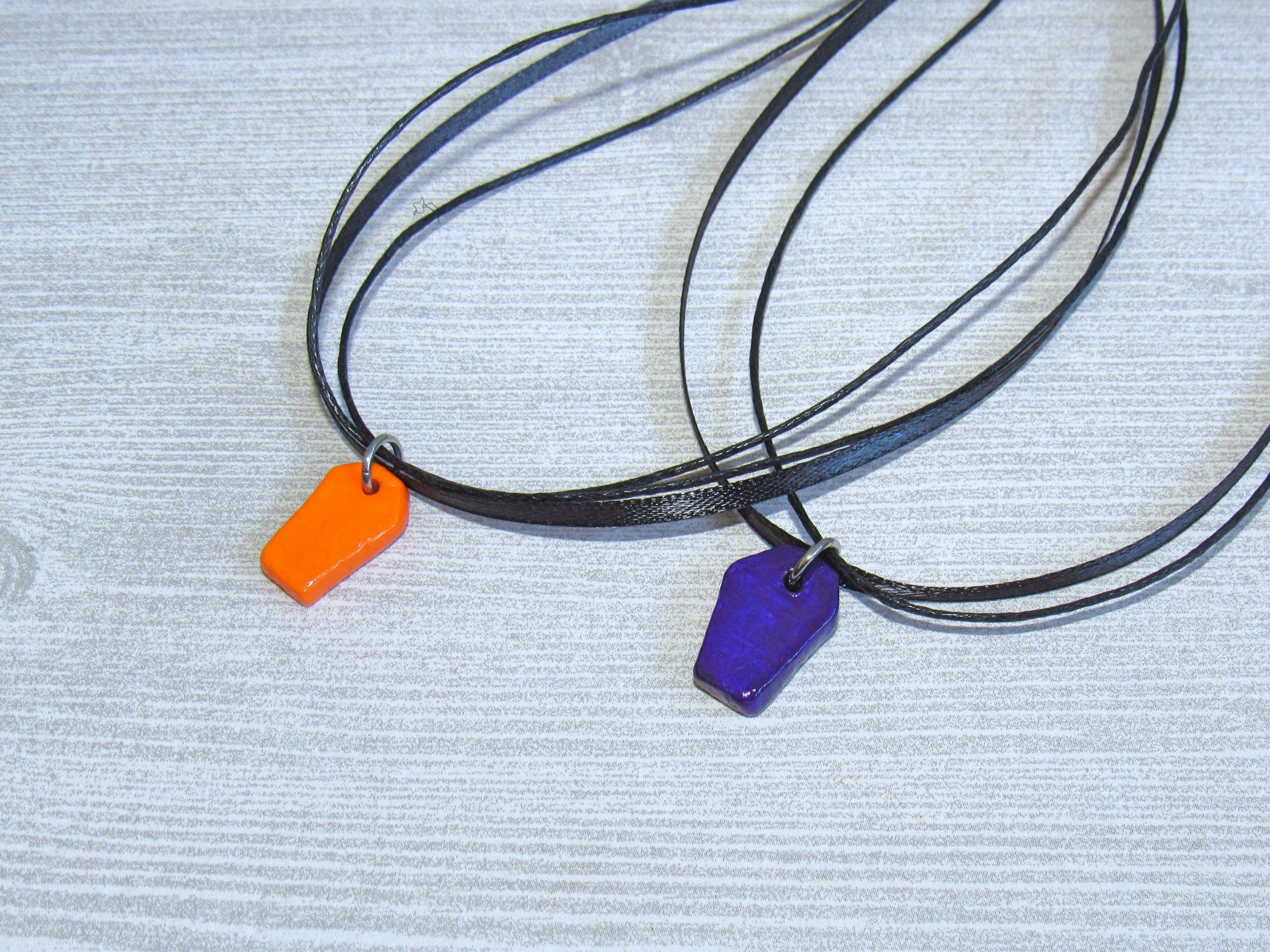 Hand sculpted itty bitty coffin charms painted and sealed with a glossy glaze, on a 13.5” long choker made from 1/8” satin ribbon and two strands of imitation leather cord. 3” chain extender. Styles shown are ready to ship, or you can custom order your choice of coffin charm color. Leave your color request in the "notes to seller" section.