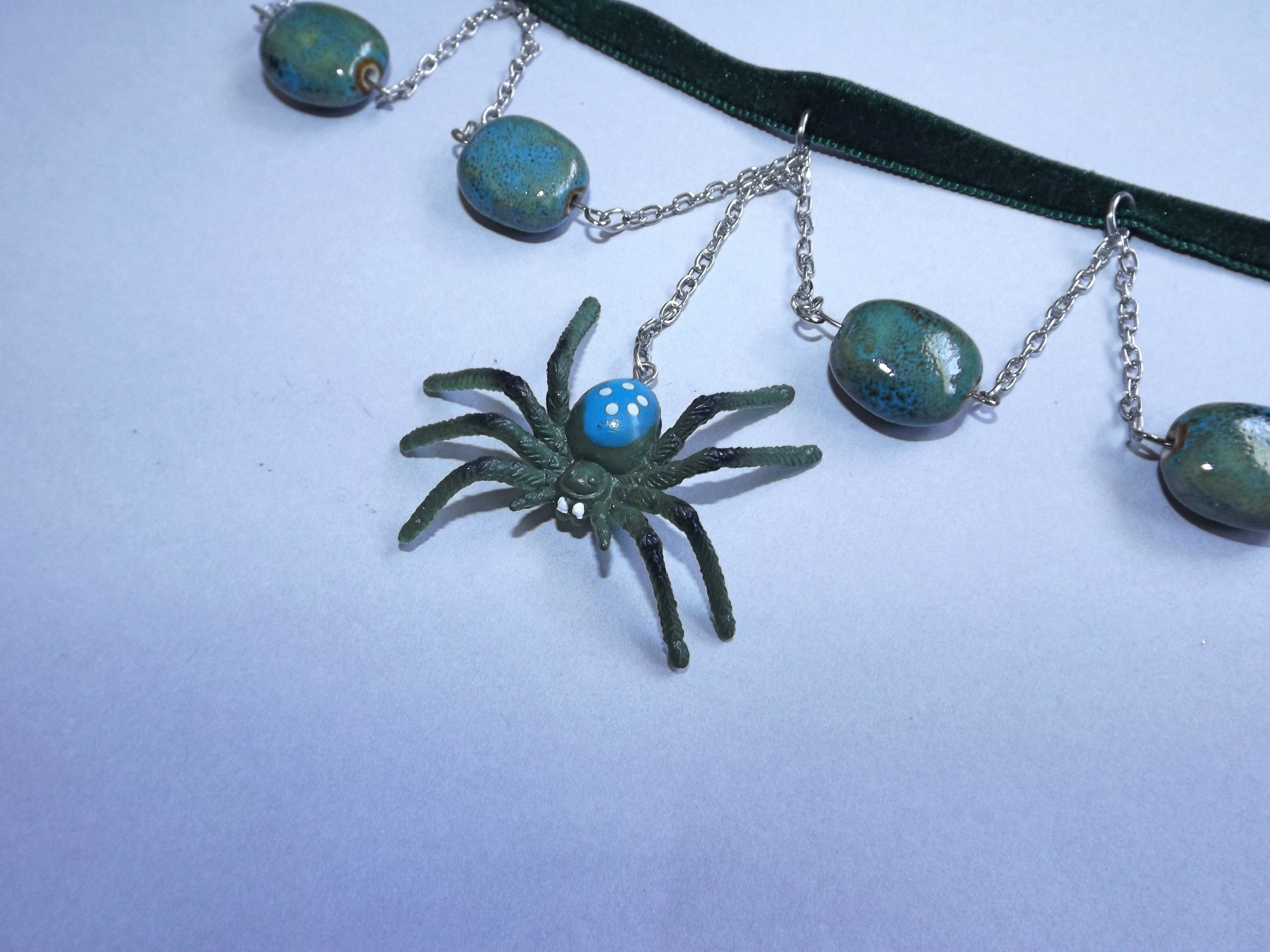 Little Miss Muffett's worst nightmare, this creepy crawly spider hangs from a silver chain attached to a deep green velvet choker along with 4 blue and green ceramic beads. 15" long with a 2" extender chain. Extra length can be added upon request.