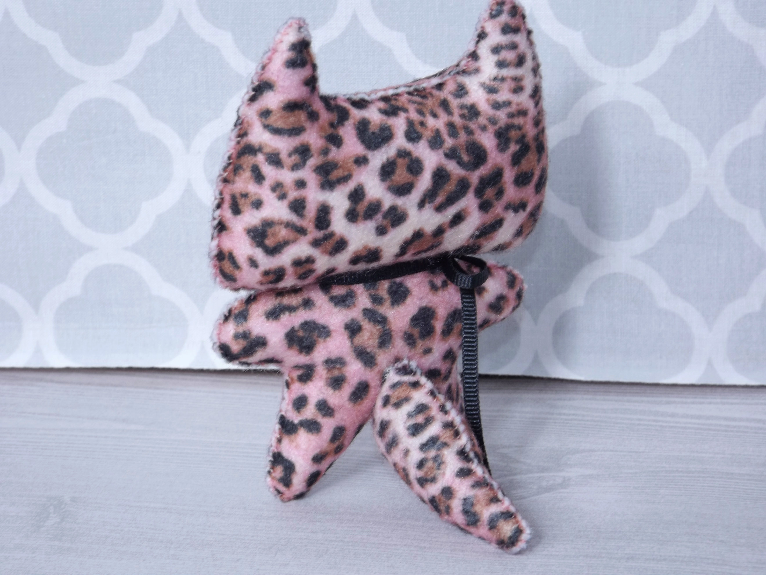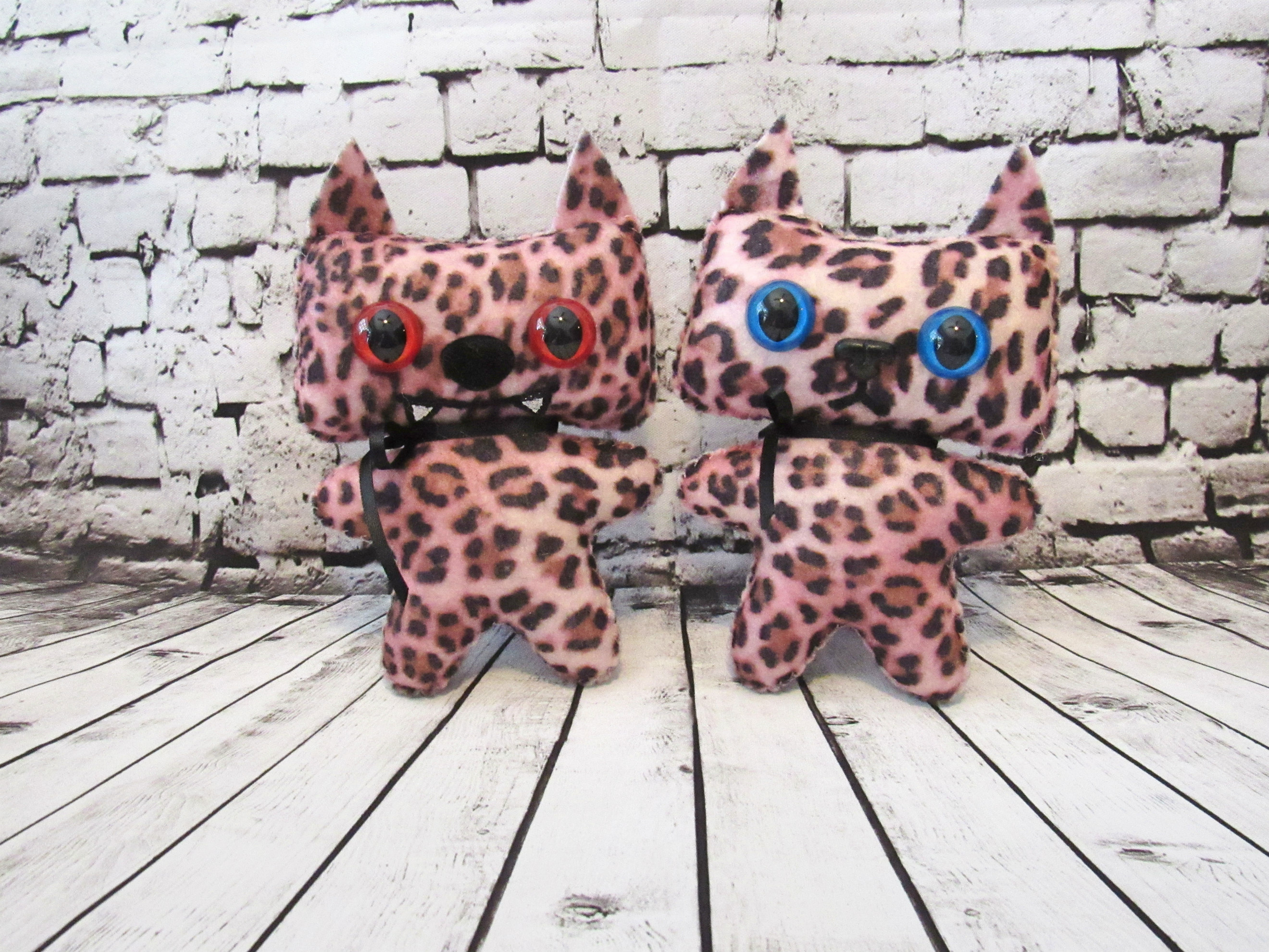 Such sweet little zombie jungle cats! These kitties are made with eco felt made from plastic bottles and painted with soft, permanent fabric paint. This printed felt has been discontinued, so these are only available as a custom order, and only while my felt supply lasts. Choose your eye, nose, and bow colors.