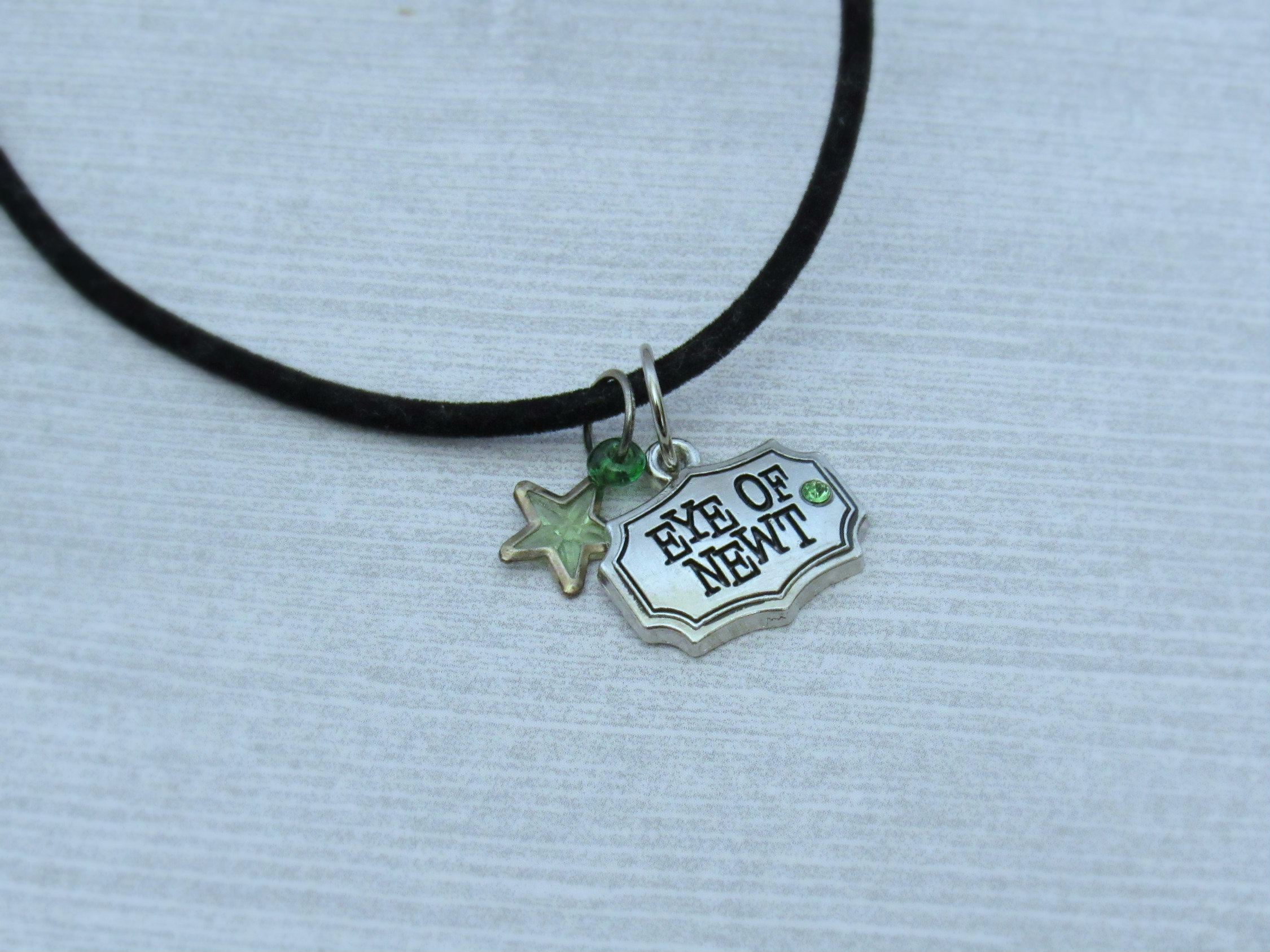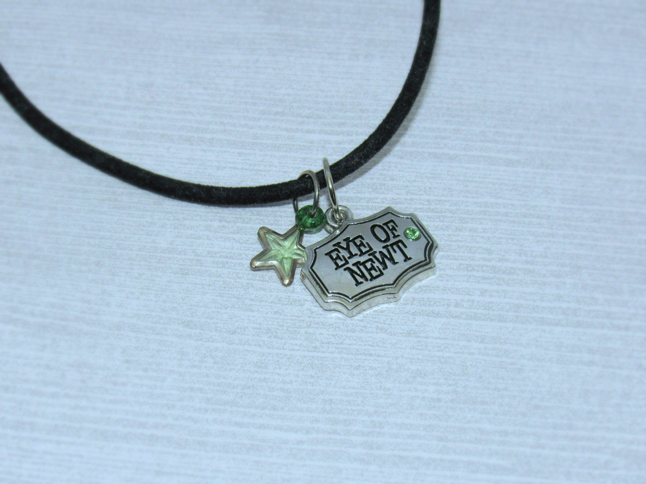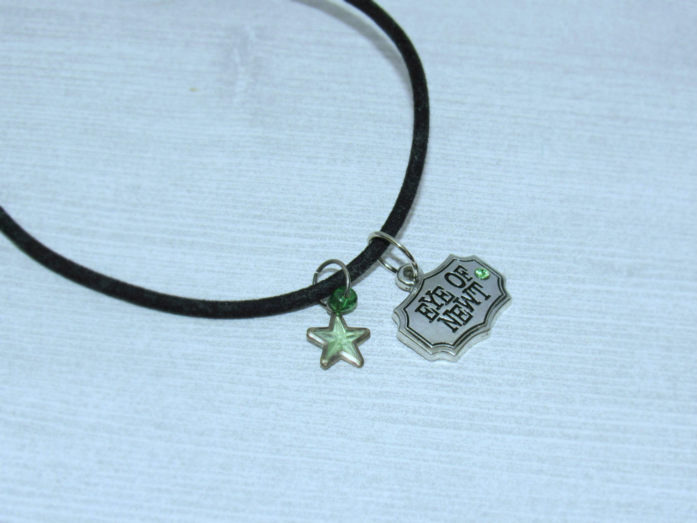 Perfect for the stylish witch, this round flocked velvet cord is adorned with a small silver star and seed bead and a delicate silver charm with a matching green gem. 18" long with a chain extender.