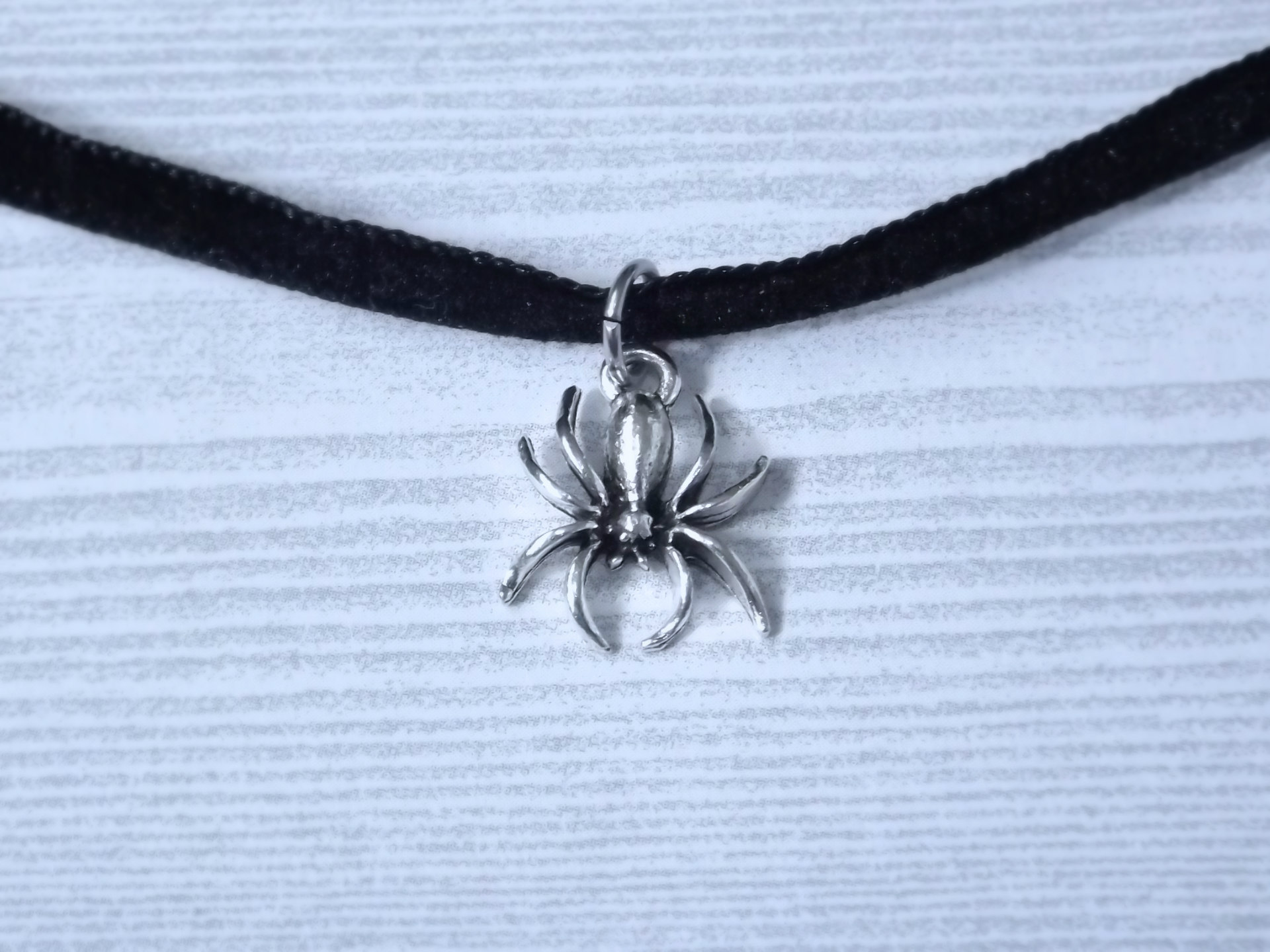 Tiny silver spider charm on a soft black velvet choker with chain extender.