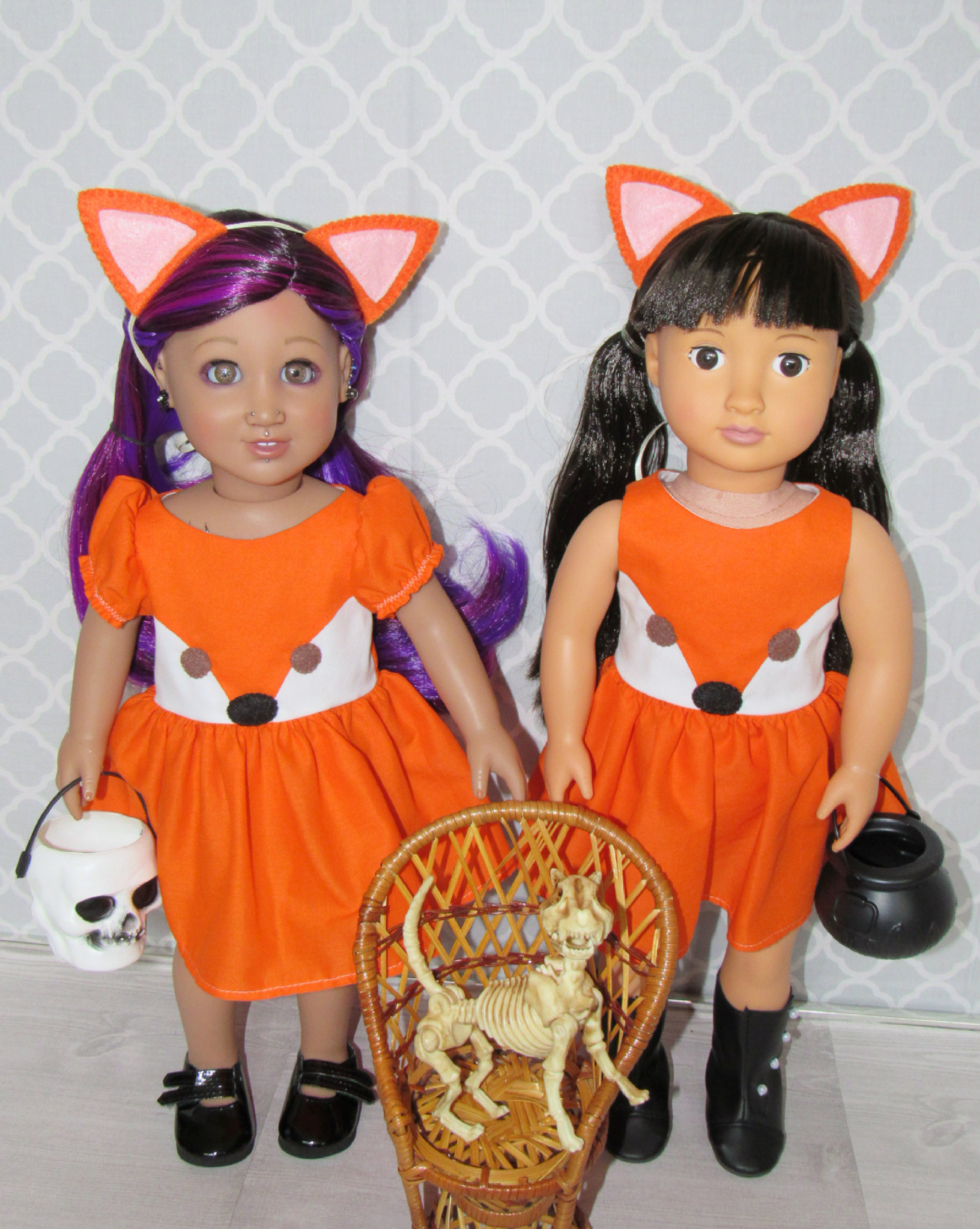 These adorable sets are just what your animal-loving dolls need to dress up for Halloween! Included are the dress (with or without sleeves) with hand-applique eyes and nose and a back zipper closure, and a pair of hand sewn felt ears on a ribbon headband. These dresses fit all standard 18" dolls like AG, OG, Madame Alexander, Adora Friends, and others. Handmade from an Avery Lane pattern.