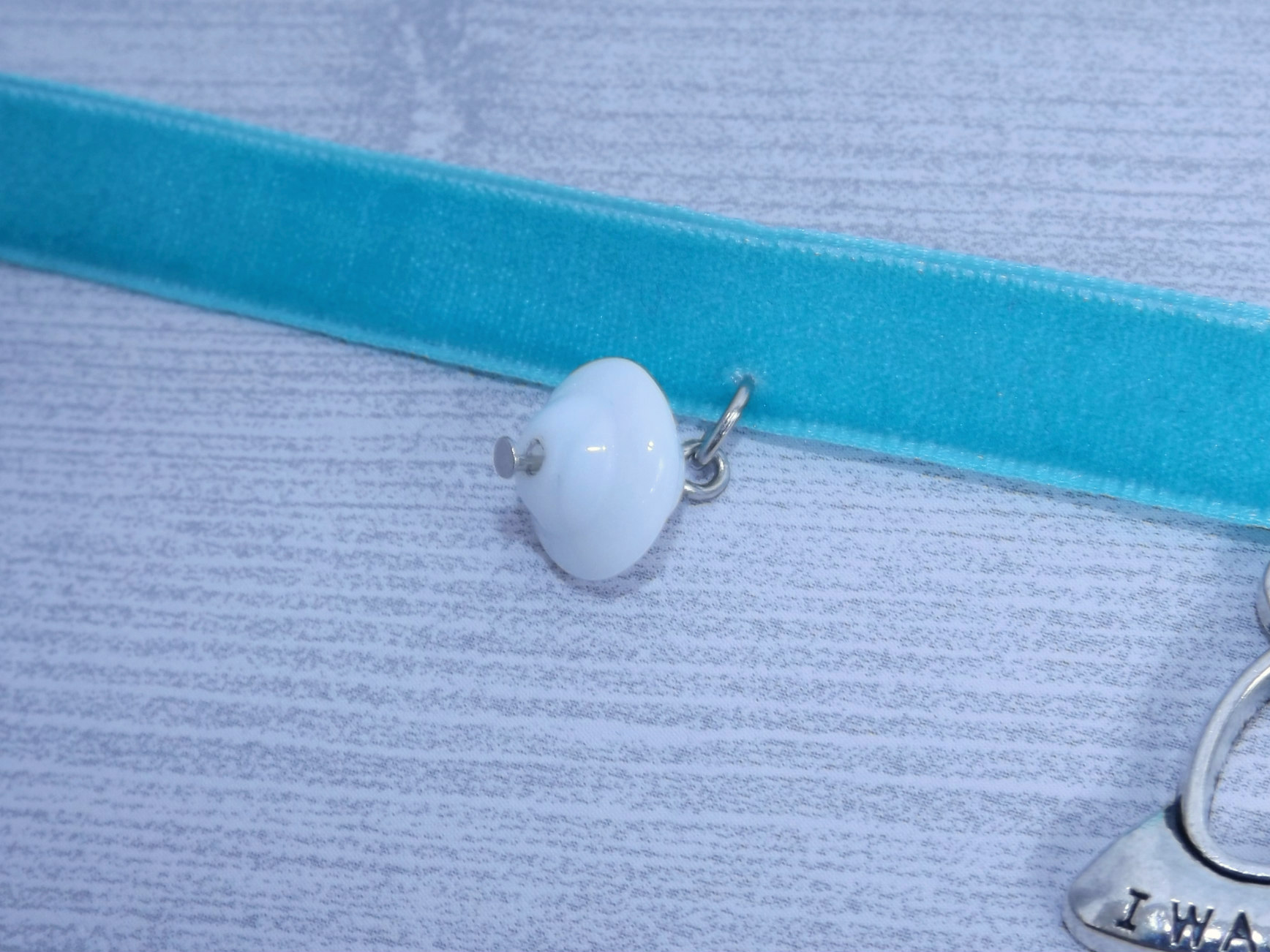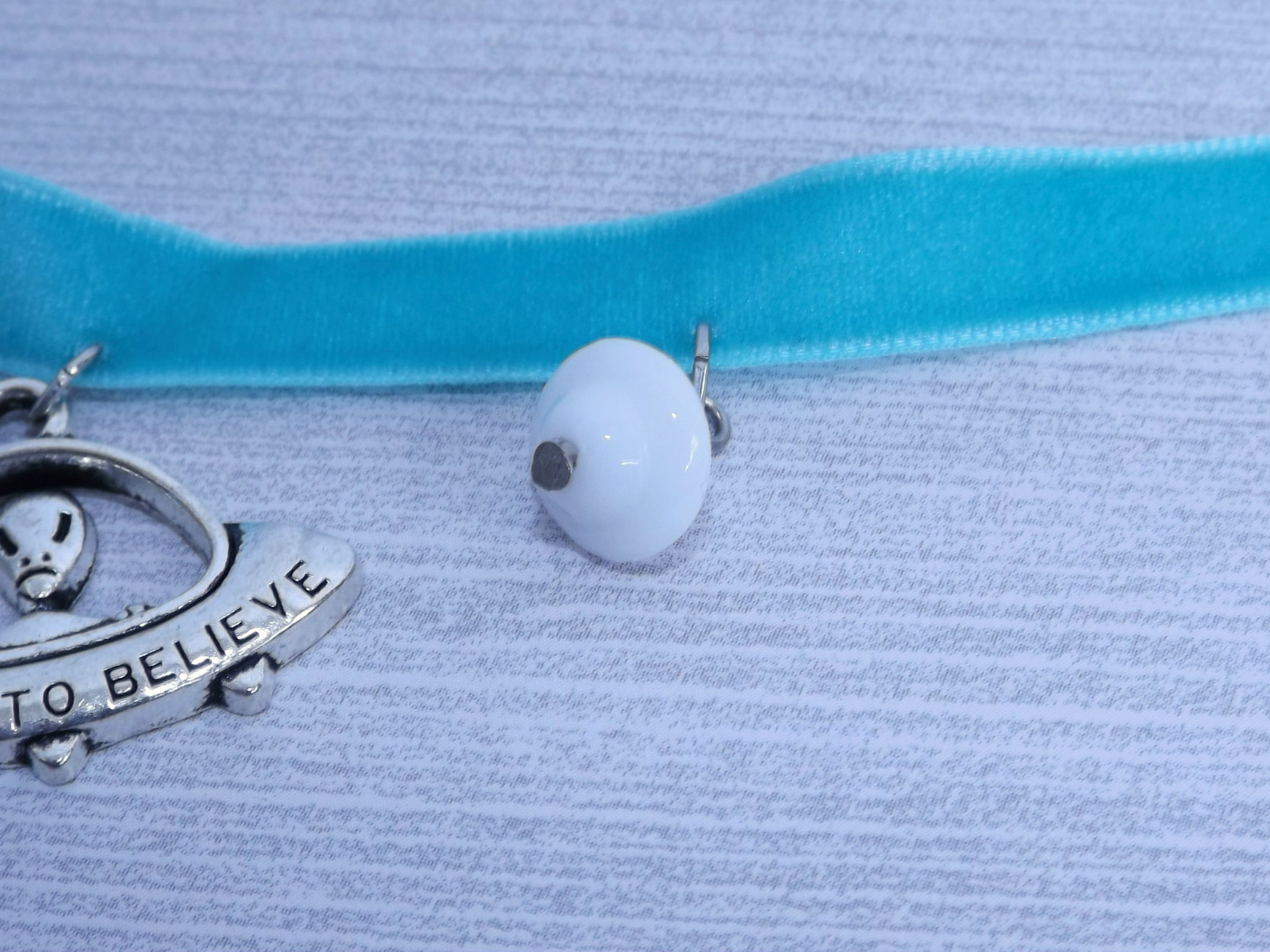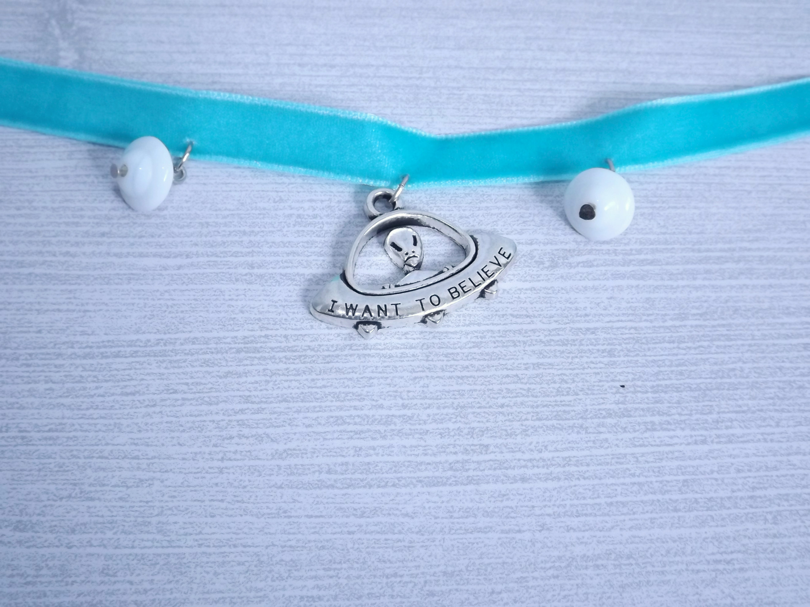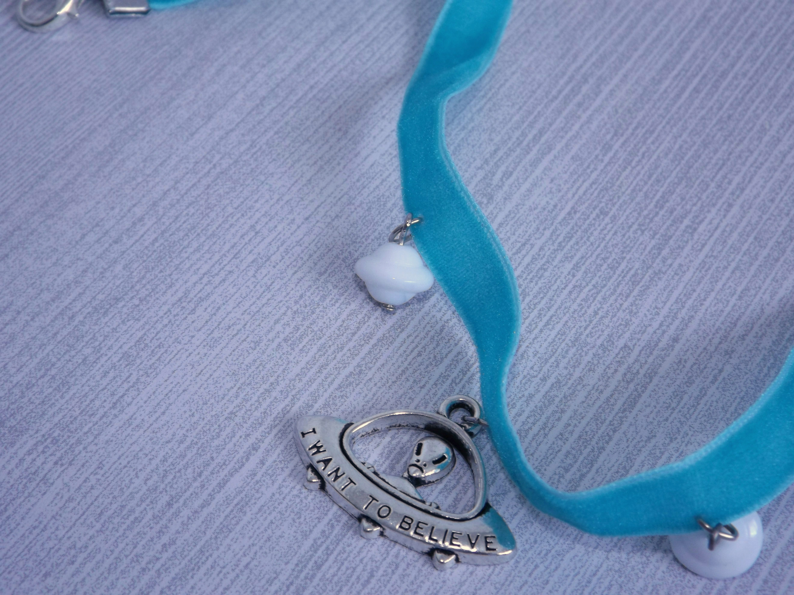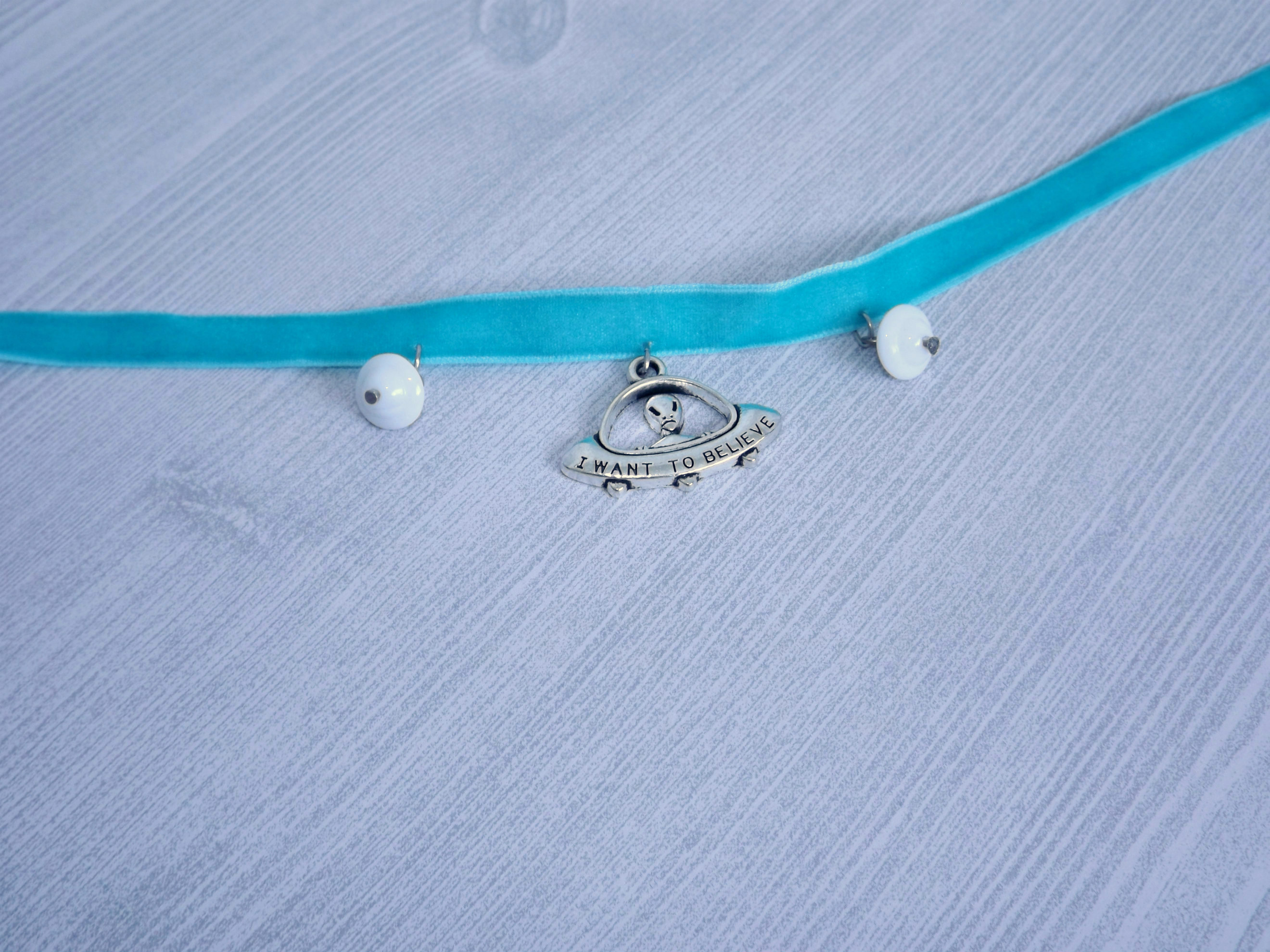 The truth is out there! Silver flying saucer pendant on super soft aqua-colored velvet ribbon bordered by two white saucer-shaped glass beads.