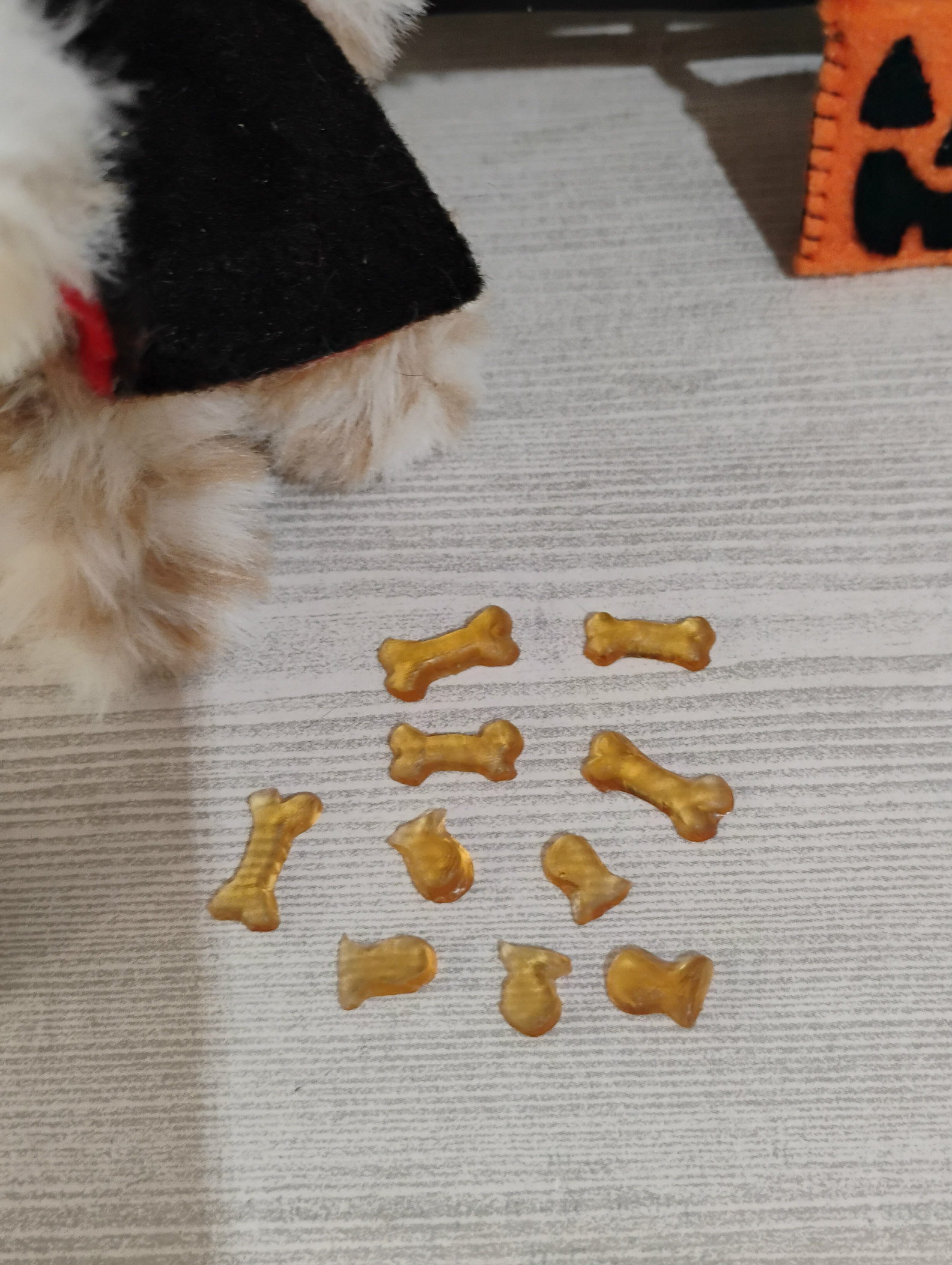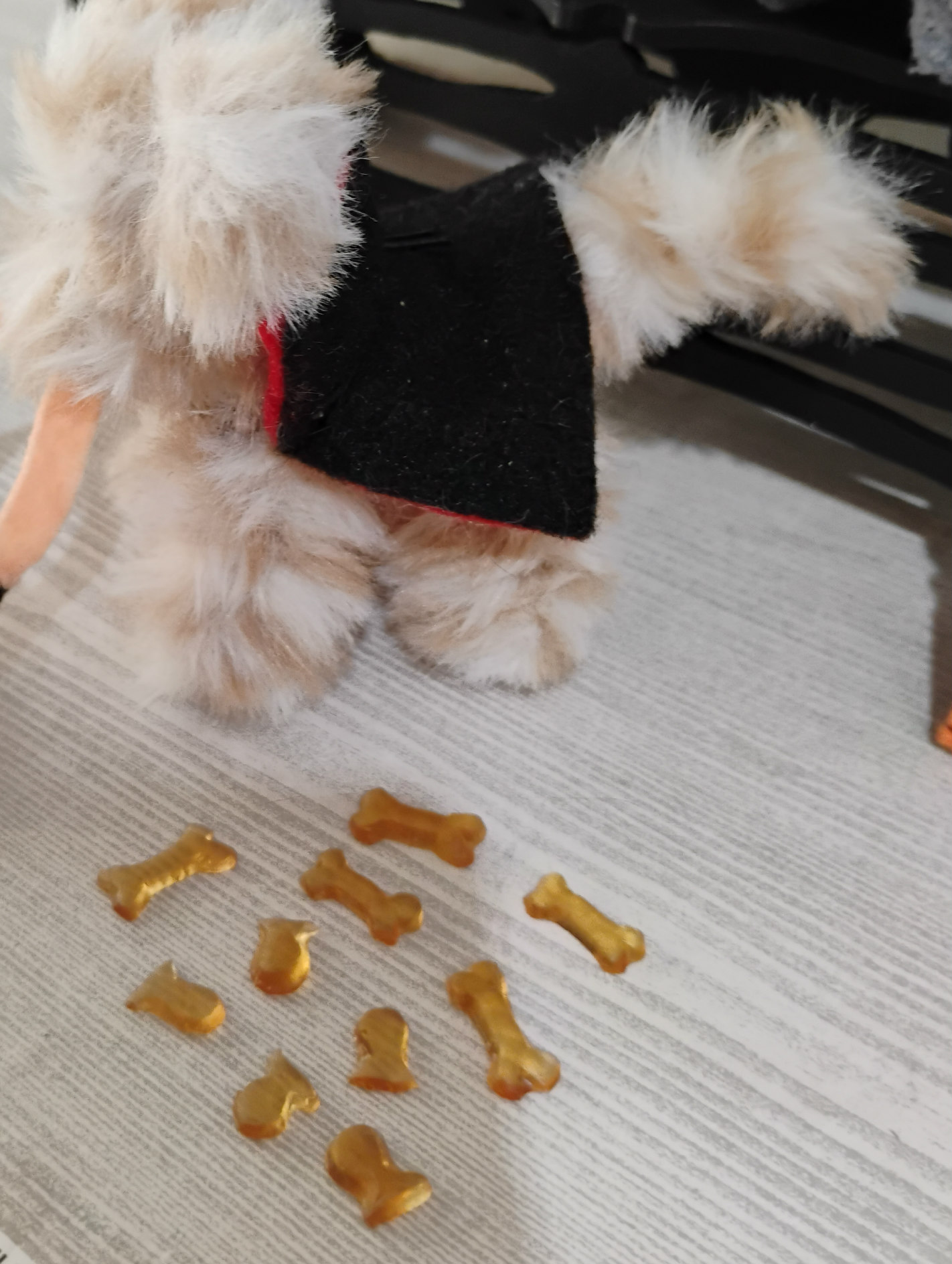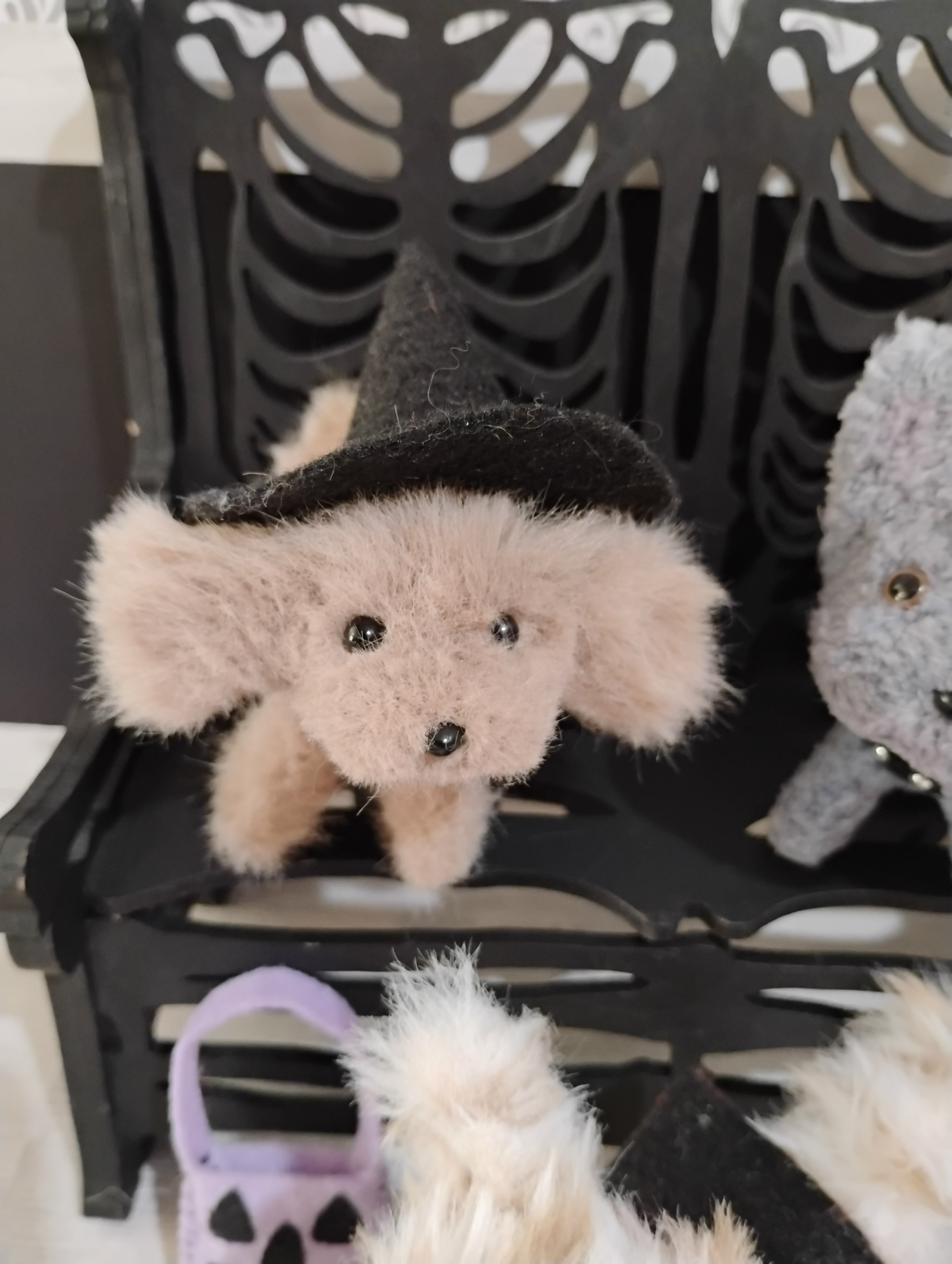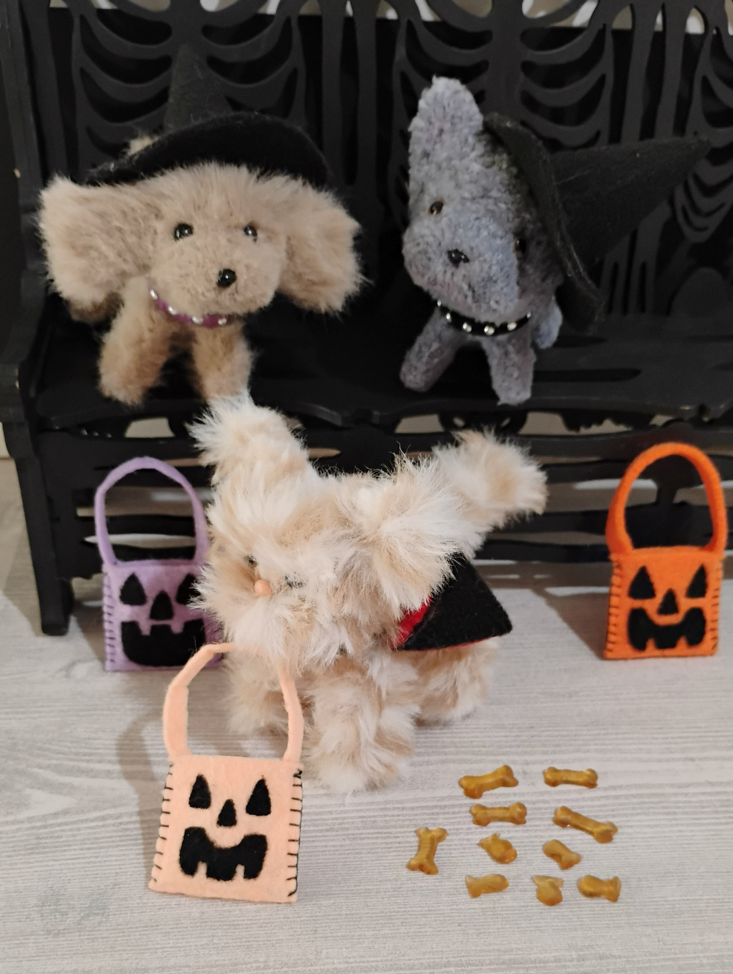 witch hat or vampire cape add-on for posable wire pets. Comes with optional orange, light purple, or light orange treat bag for collecting biscuits!
