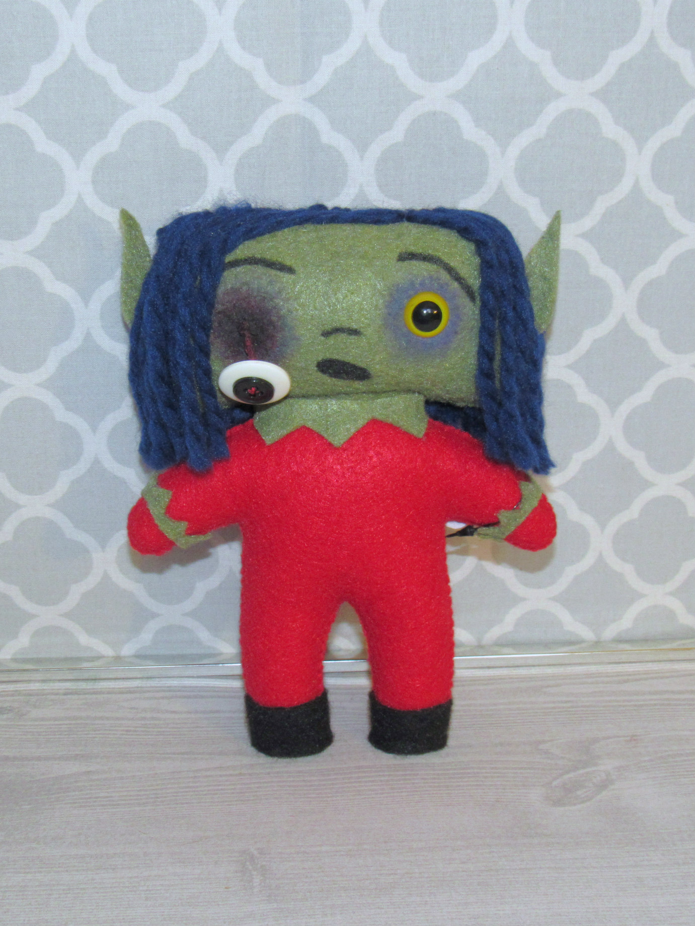 Like all Blockheads, these elves are made entirely by hand and are completely unique. They are made with my new prototype Big Blockhead body with weighted, flat feet for standing. They are around 7" tall (not including hats) and are around 5 1/2" wide.