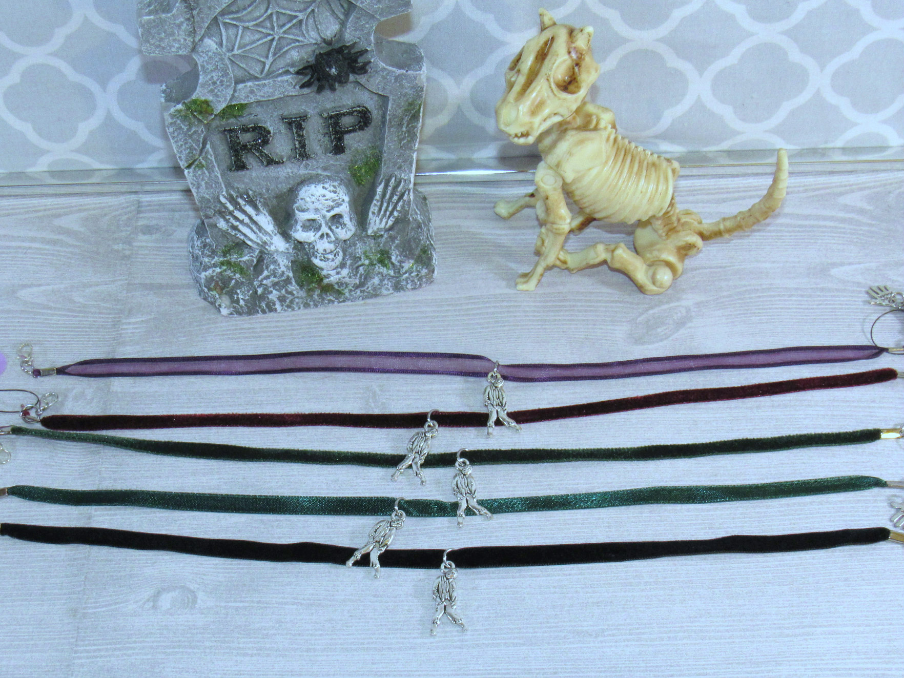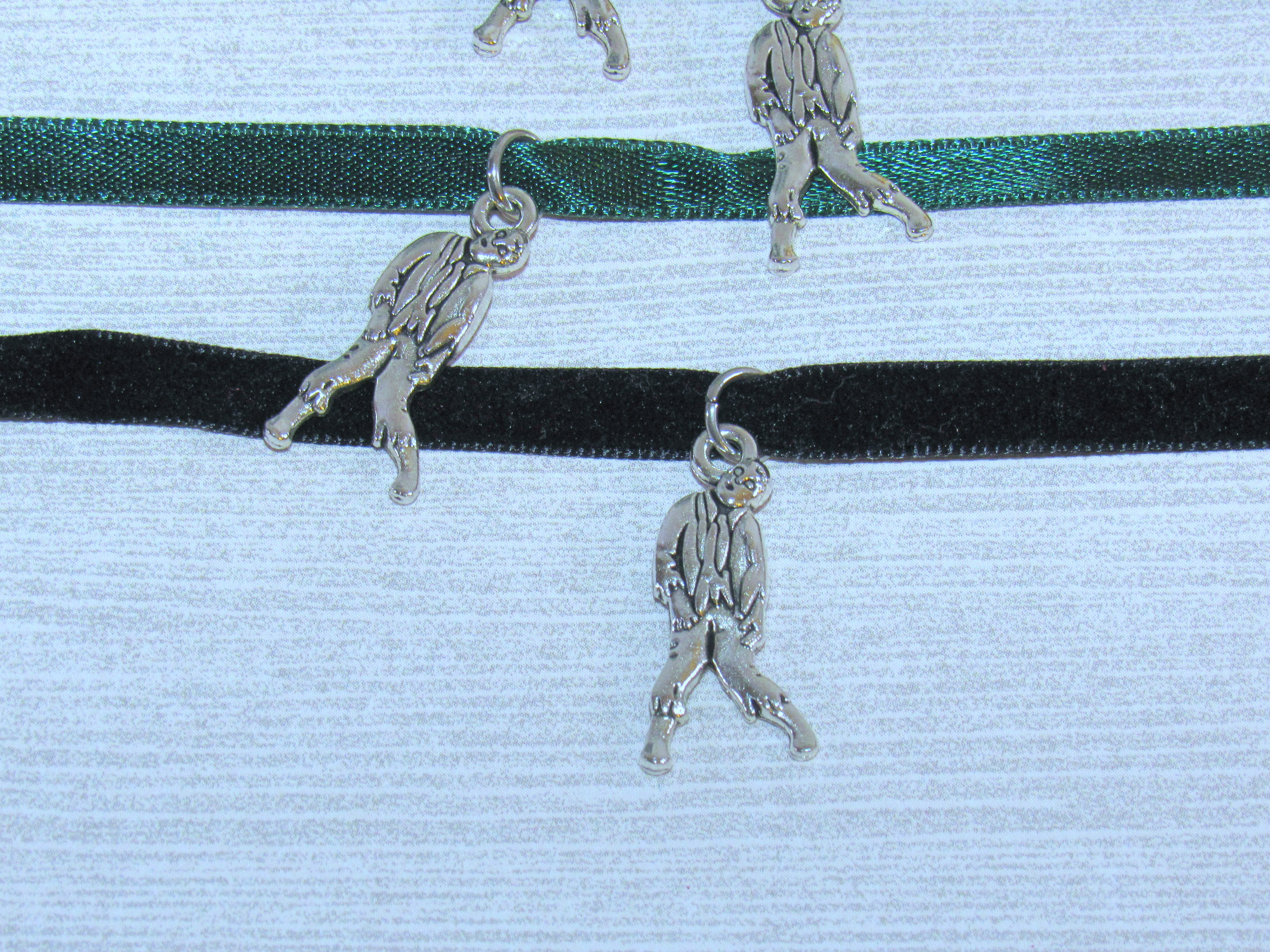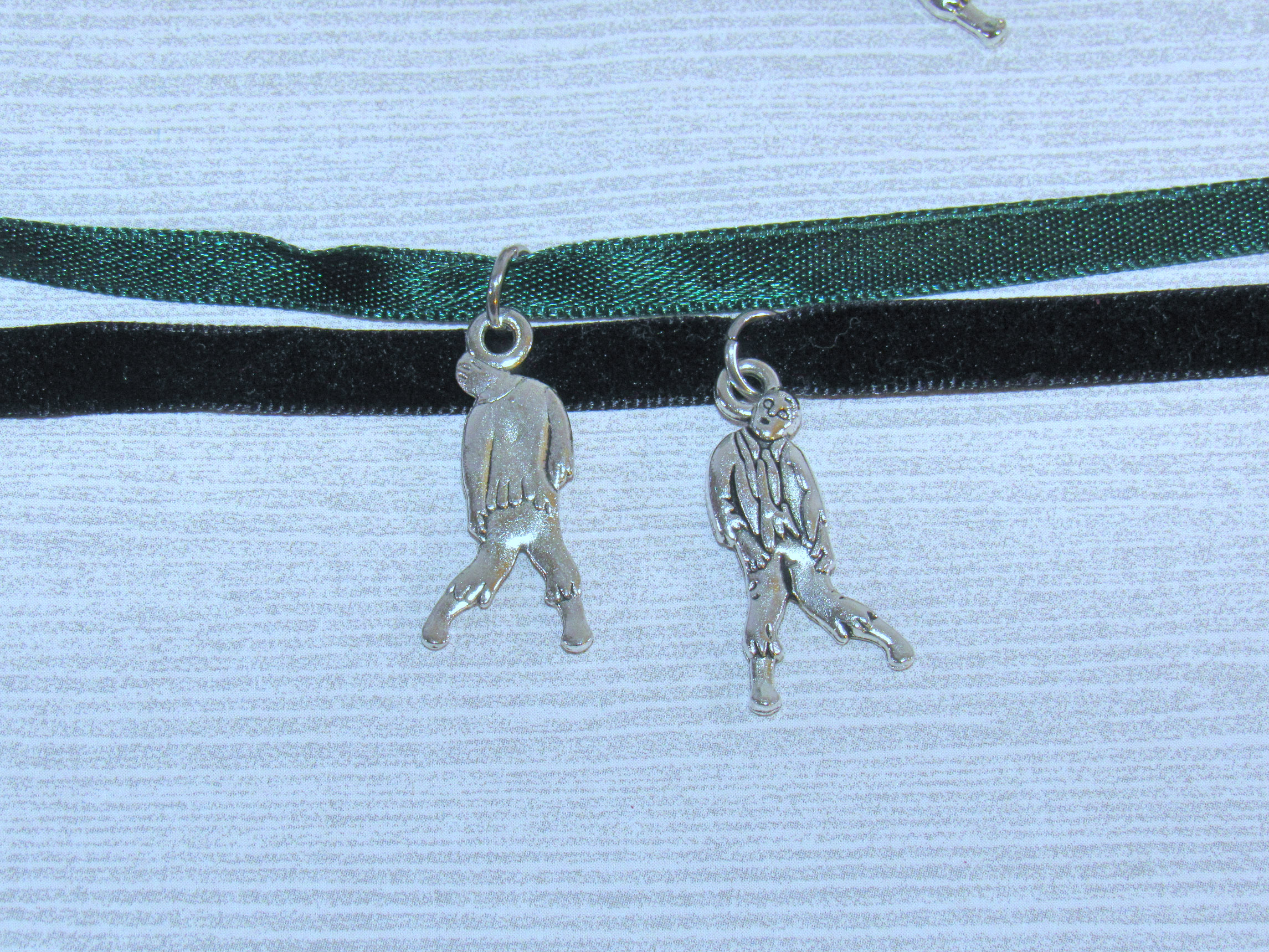 Silver shambling zombie charms on ribbon chokers. All are 13" long with a 3" extender chain. Extra length can be added upon request.