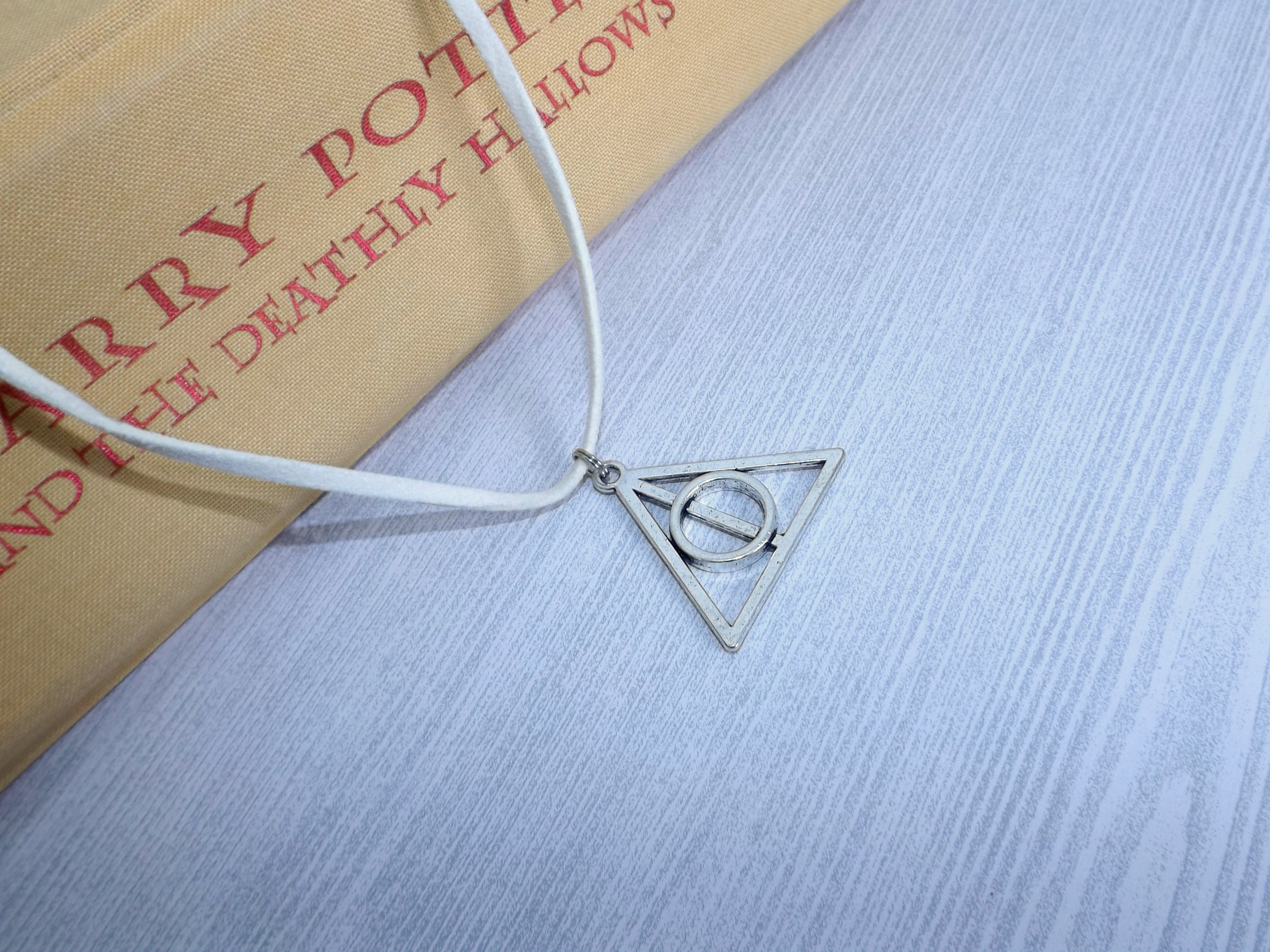 Show your Harry Potter pride with this aged silver Deathly Hallows pendant on an ivory faux suede cord.