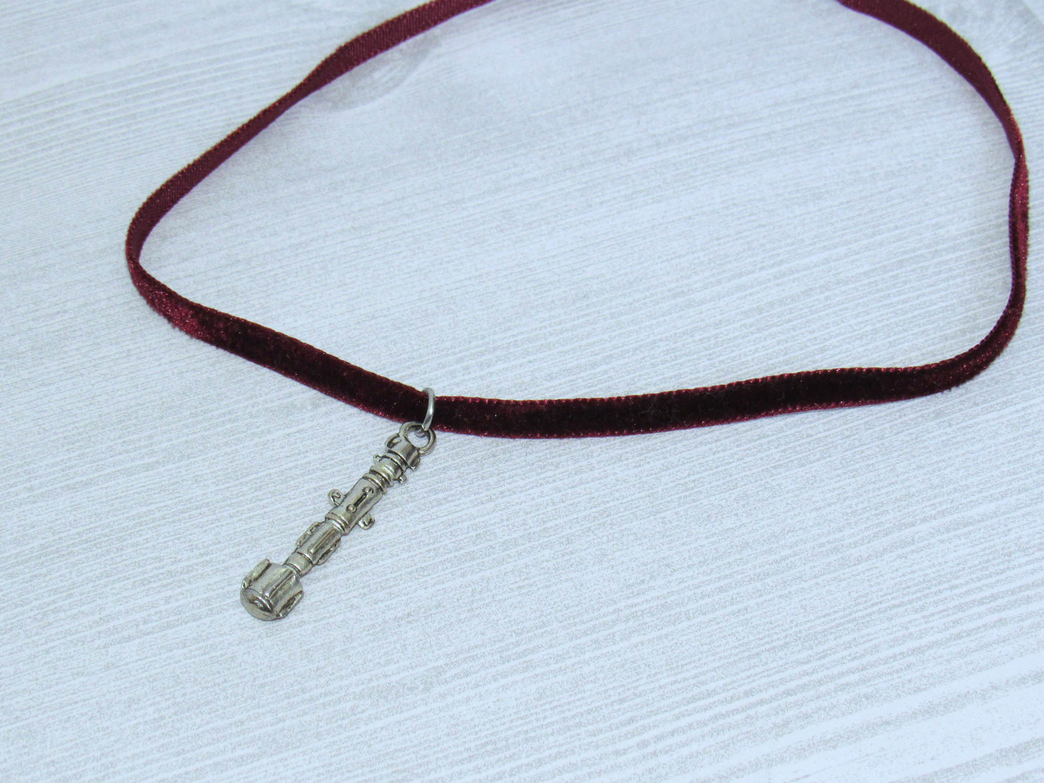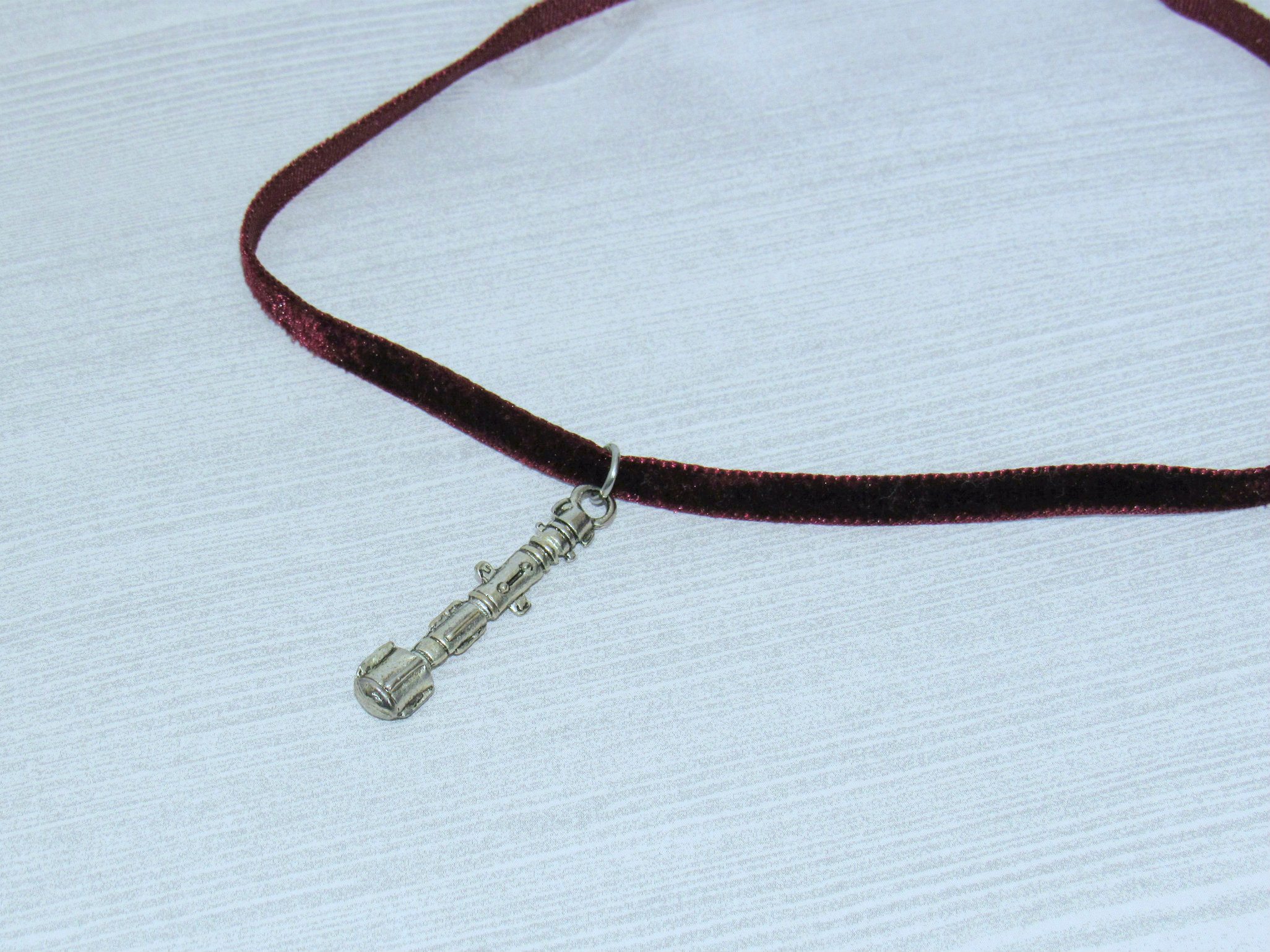 It doesn't do wood, but it *does* look great paired with your favorite Doctor Who-themed outfit or cosplay! Silver sonic screwdriver pendant on a 15 1/2" long deep red velvet ribbon choker with a 2" extender chain. Extra length can be added upon request.
