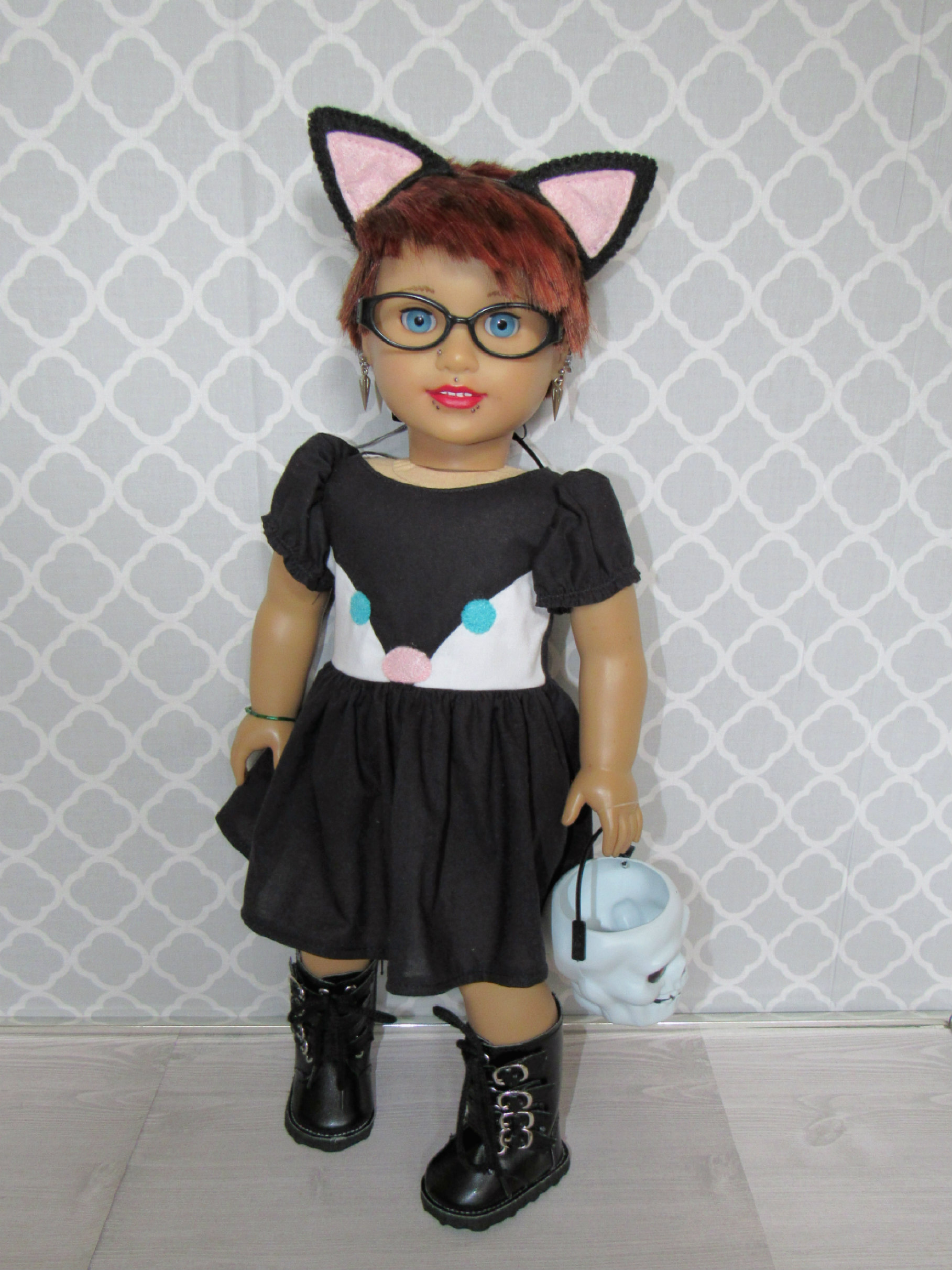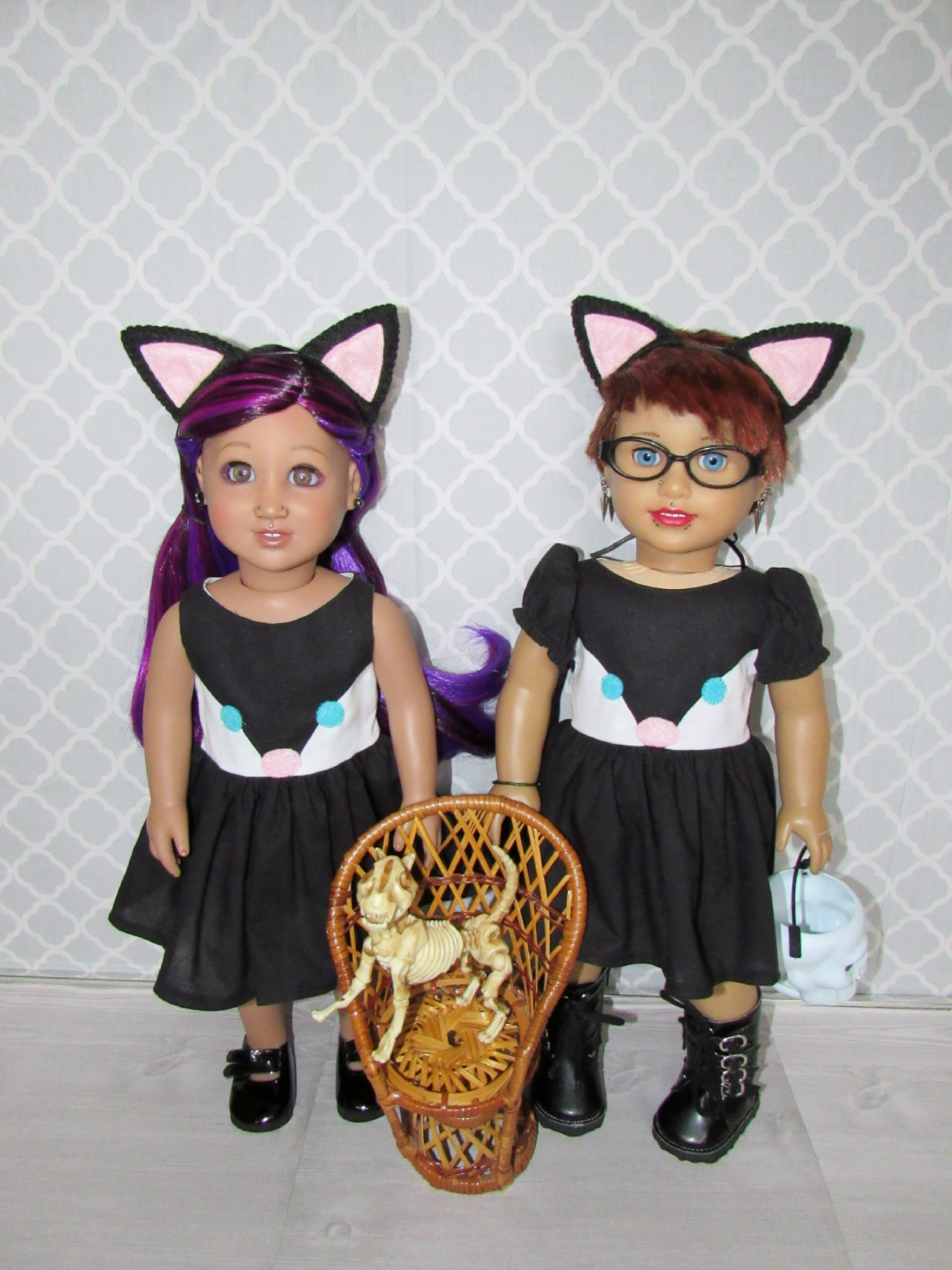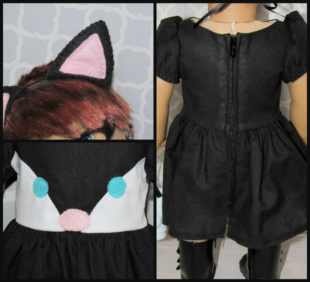 These adorable sets are just what your animal-loving dolls need to dress up for Halloween! Included are the dress (with or without sleeves) with hand-applique eyes and nose and a back zipper closure, and a pair of hand sewn felt ears on a ribbon headband. These dresses fit all standard 18" dolls like AG, OG, Madame Alexander, Adora Friends, and others. Handmade from an Avery Lane pattern.