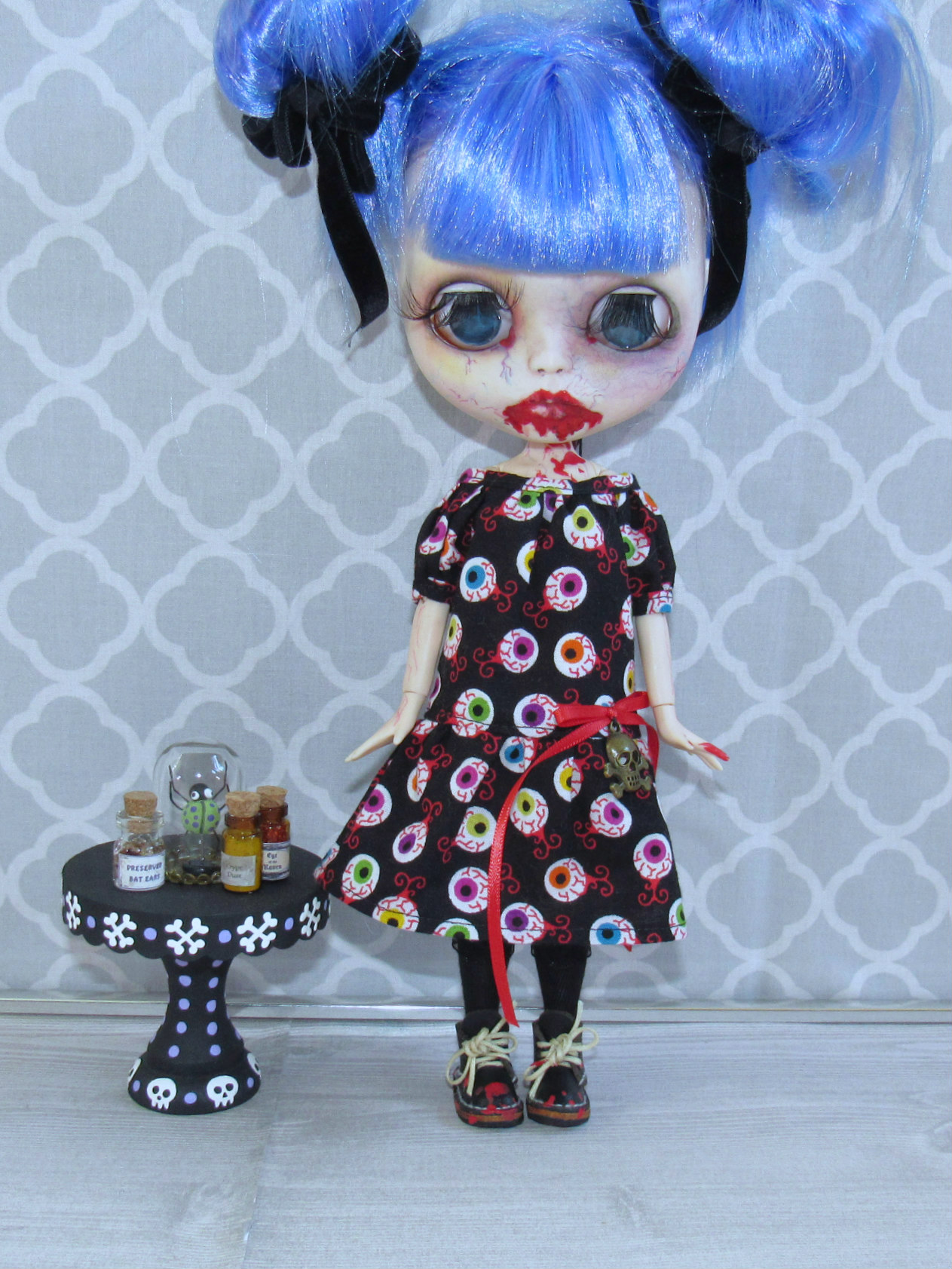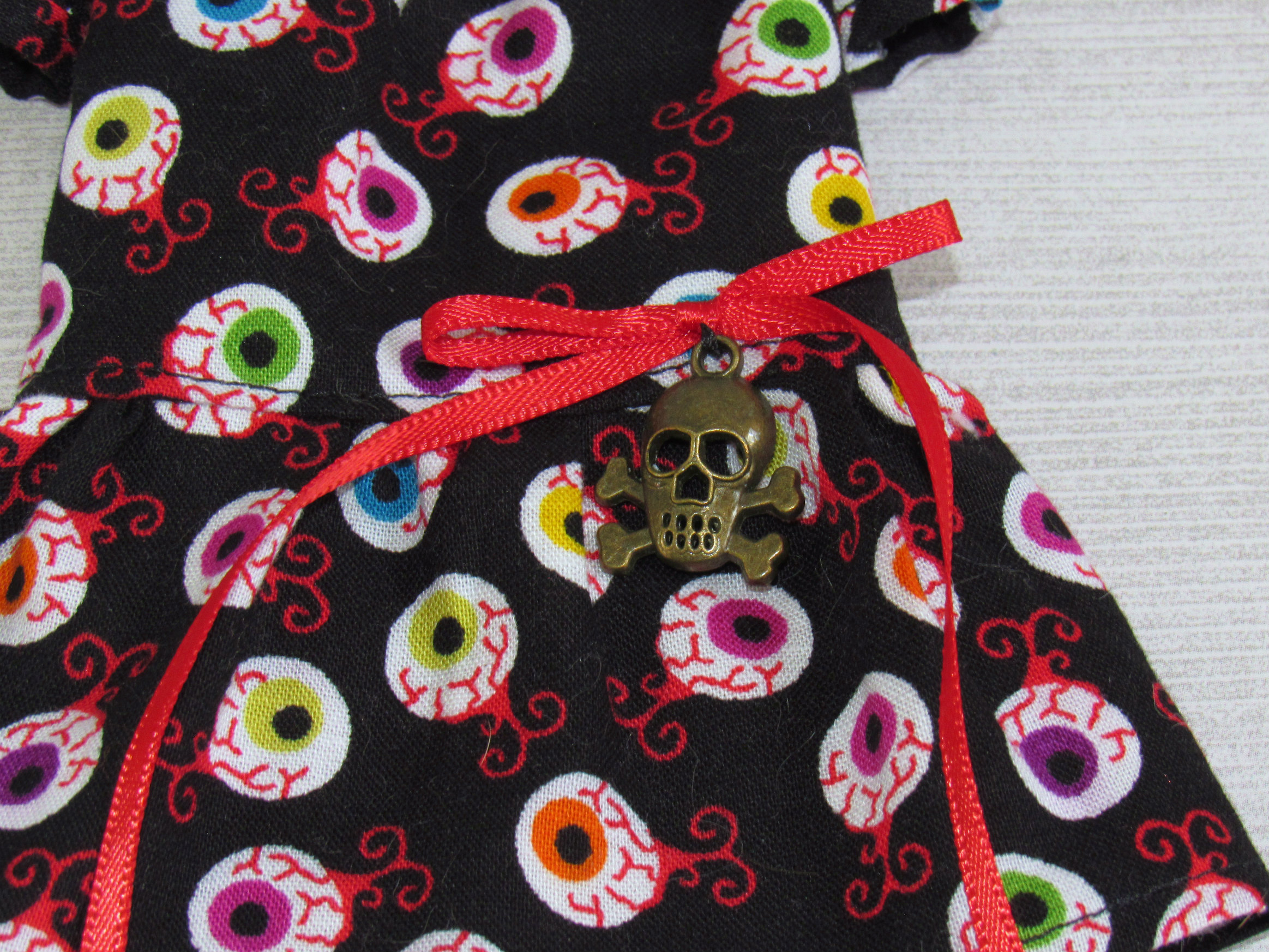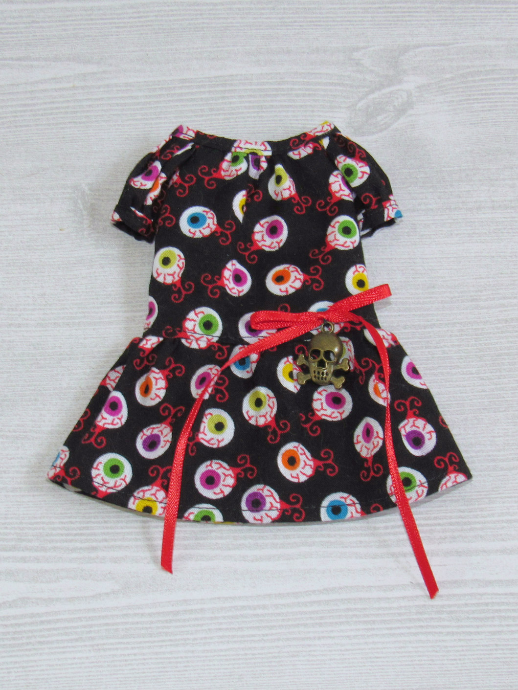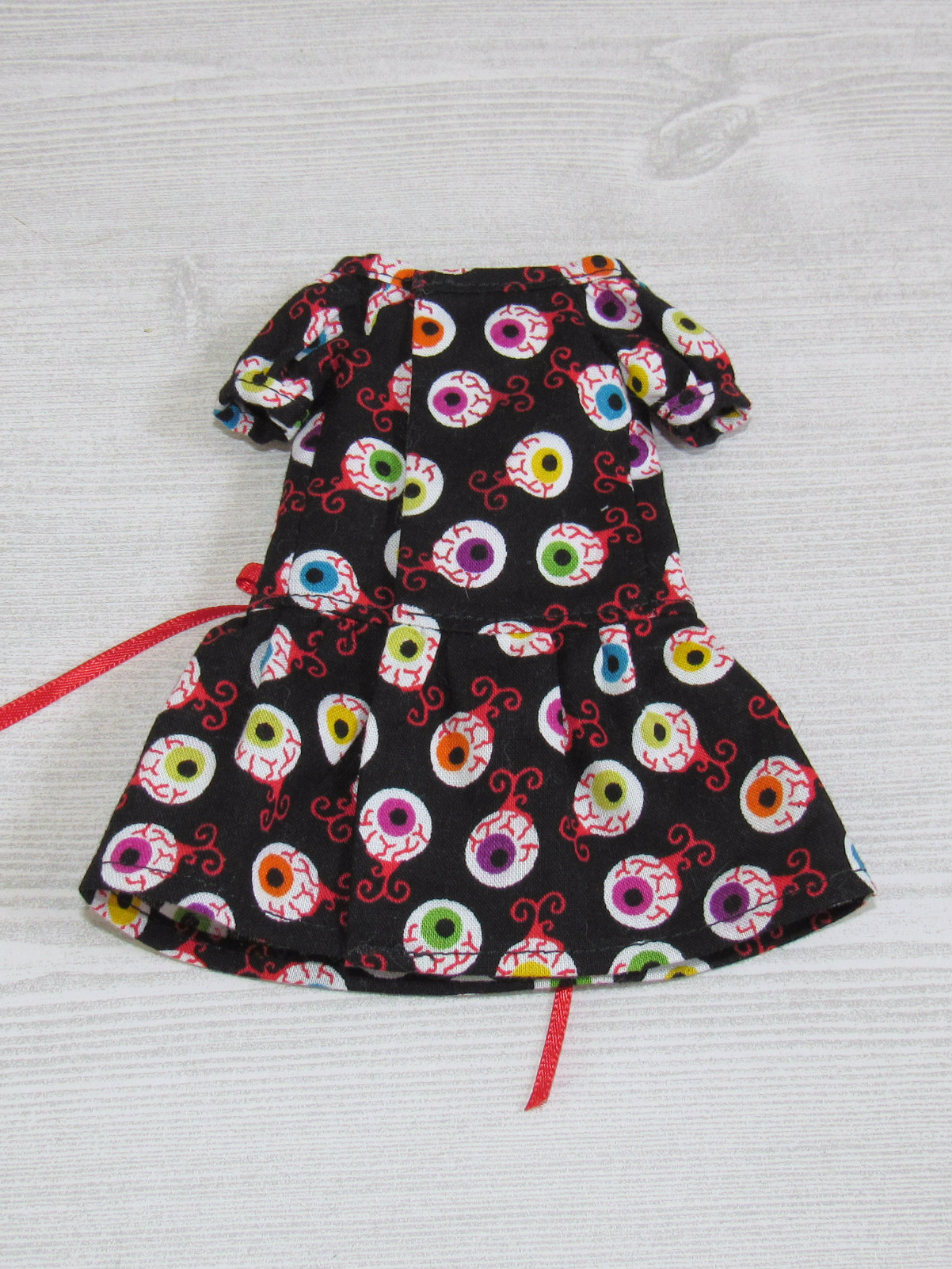 Vintage-style dress in cute spooky eyeball print, with a red bow and skull charm accent at the waist. Fits all Blythe bodies, Pullip, Rainbow High, and other slim 1:6 scale/ 11-12" fashion dolls.