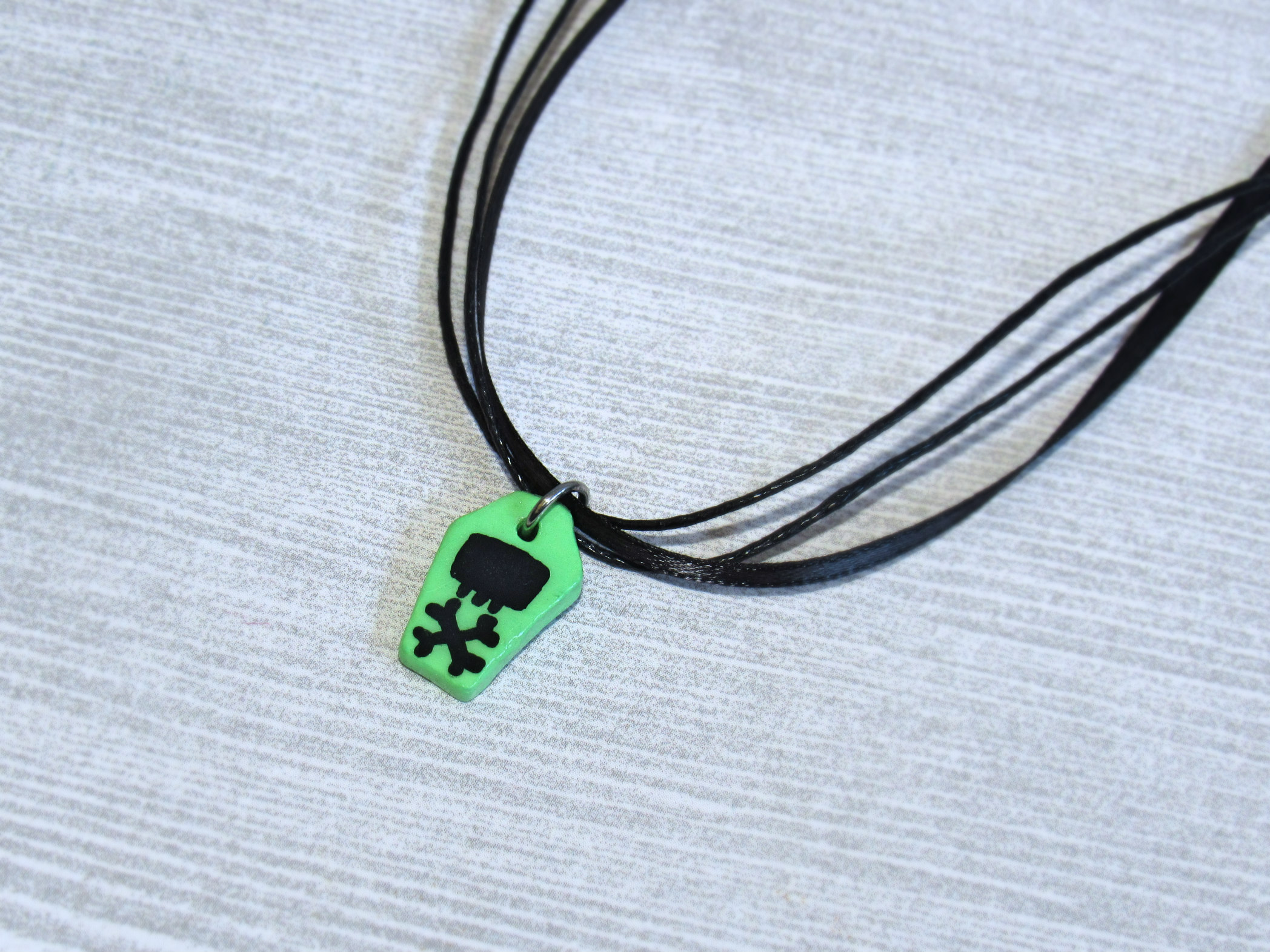 Hand sculpted itty bitty coffin charm painted with a Blockhead skull and crossbones and sealed with a glossy glaze, on a 13.5” long choker made from 1/8” satin ribbon and two strands of imitation leather cord. 3” chain extender. Style shown is ready to ship, or you can custom order your choice of coffin charm color. Leave your color request in the "notes to seller" section.