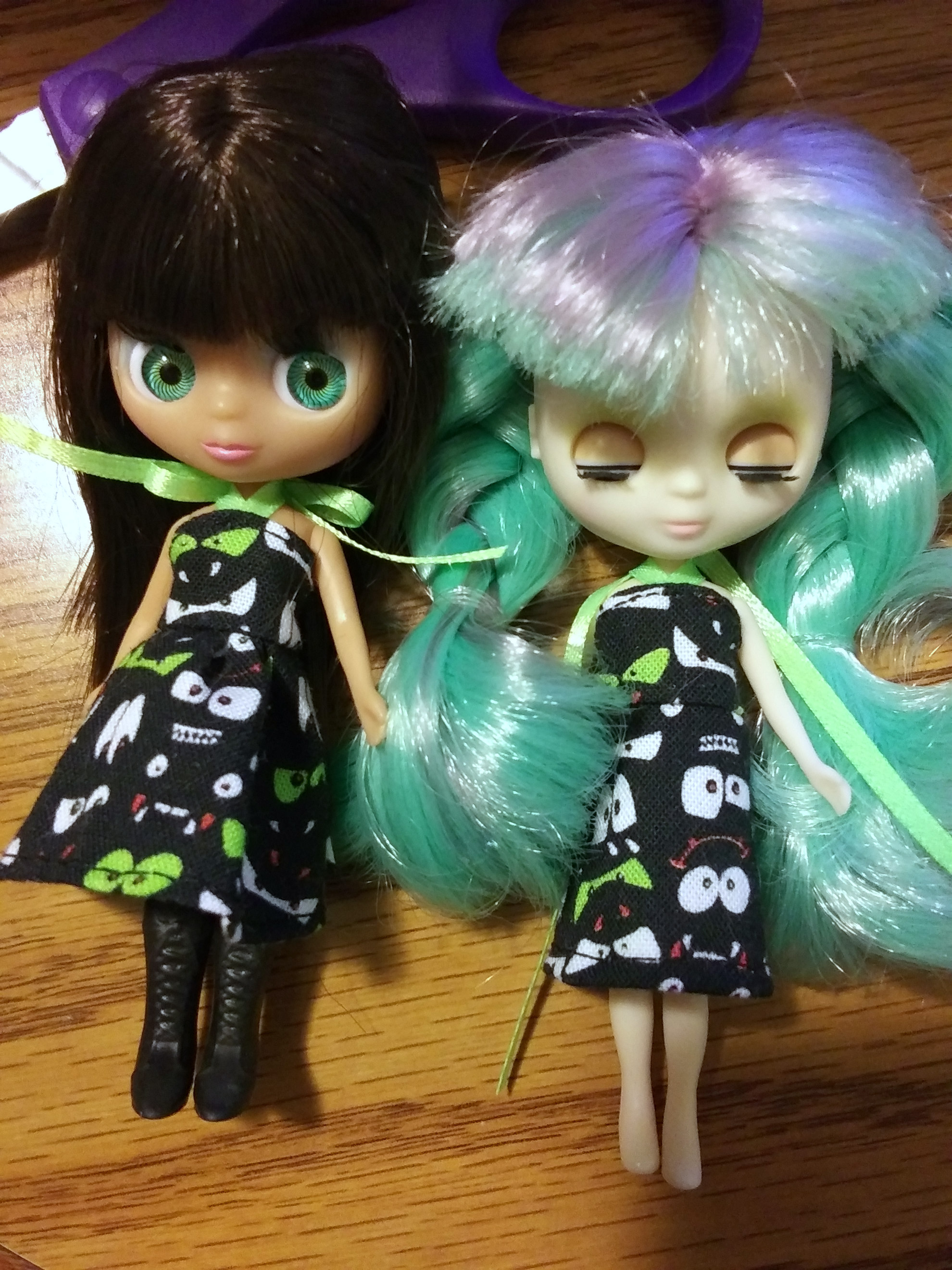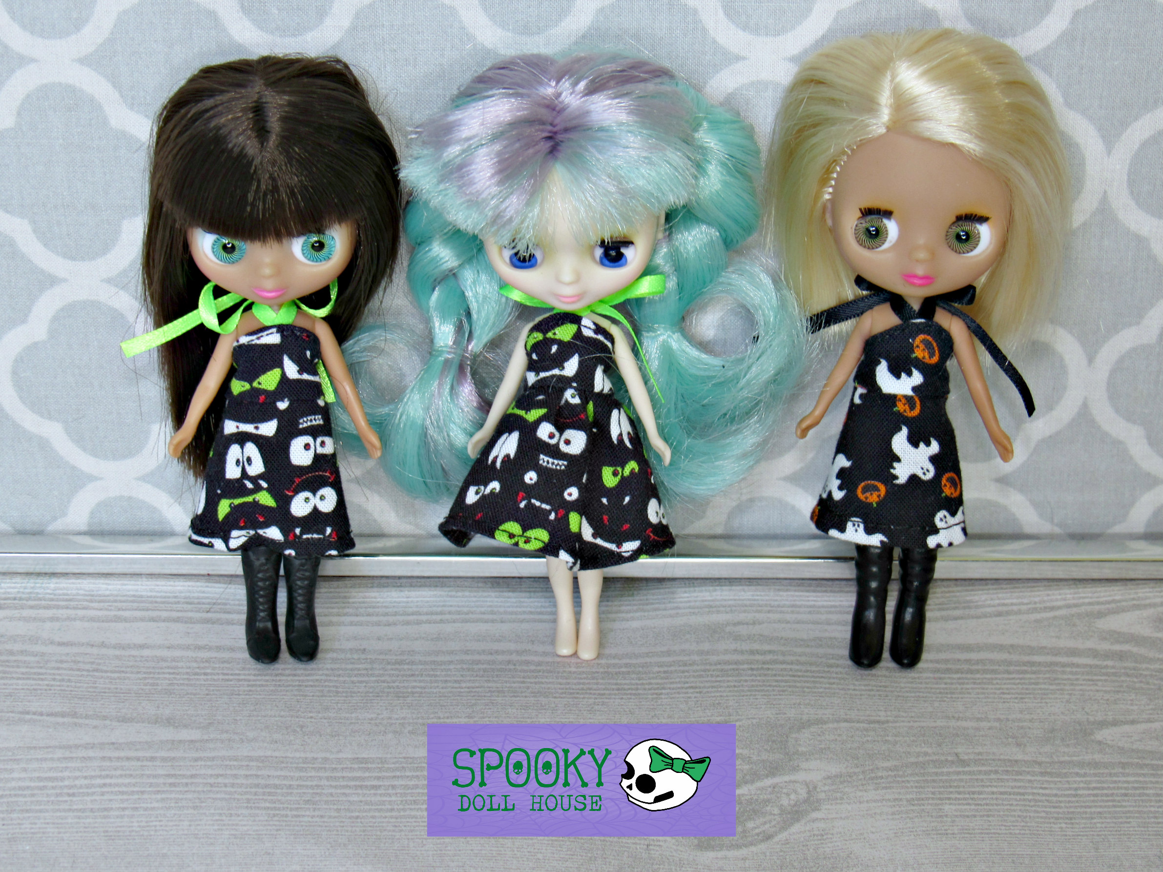 Black cotton halter dress fits Petite Blythe and Mini Pullip dolls. Closes with a snap in the back.