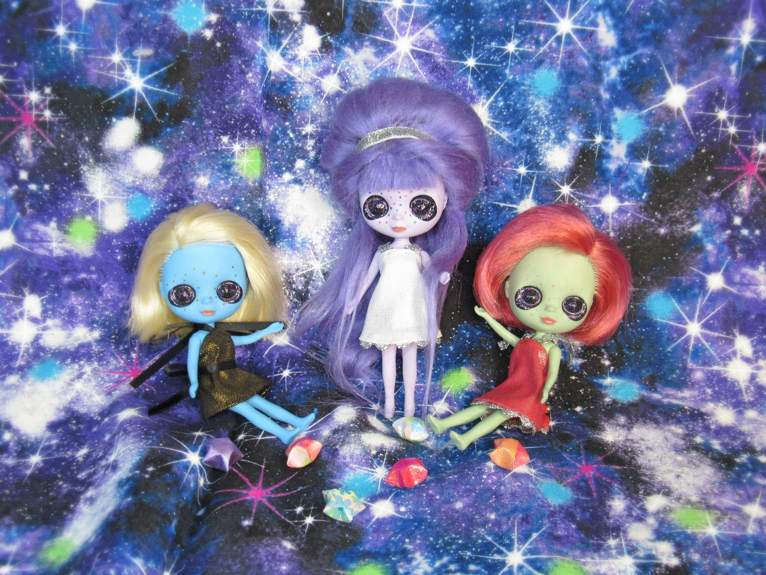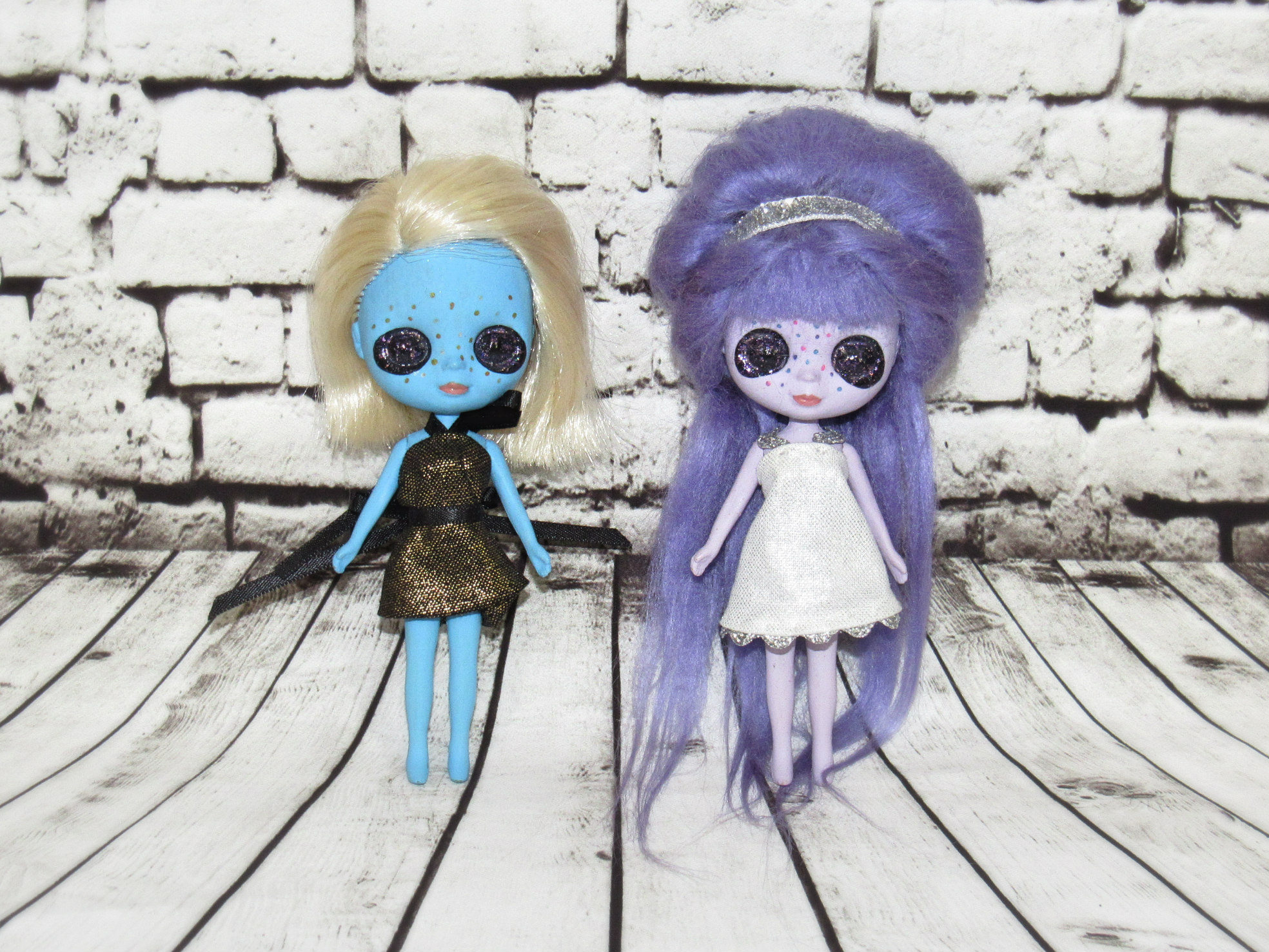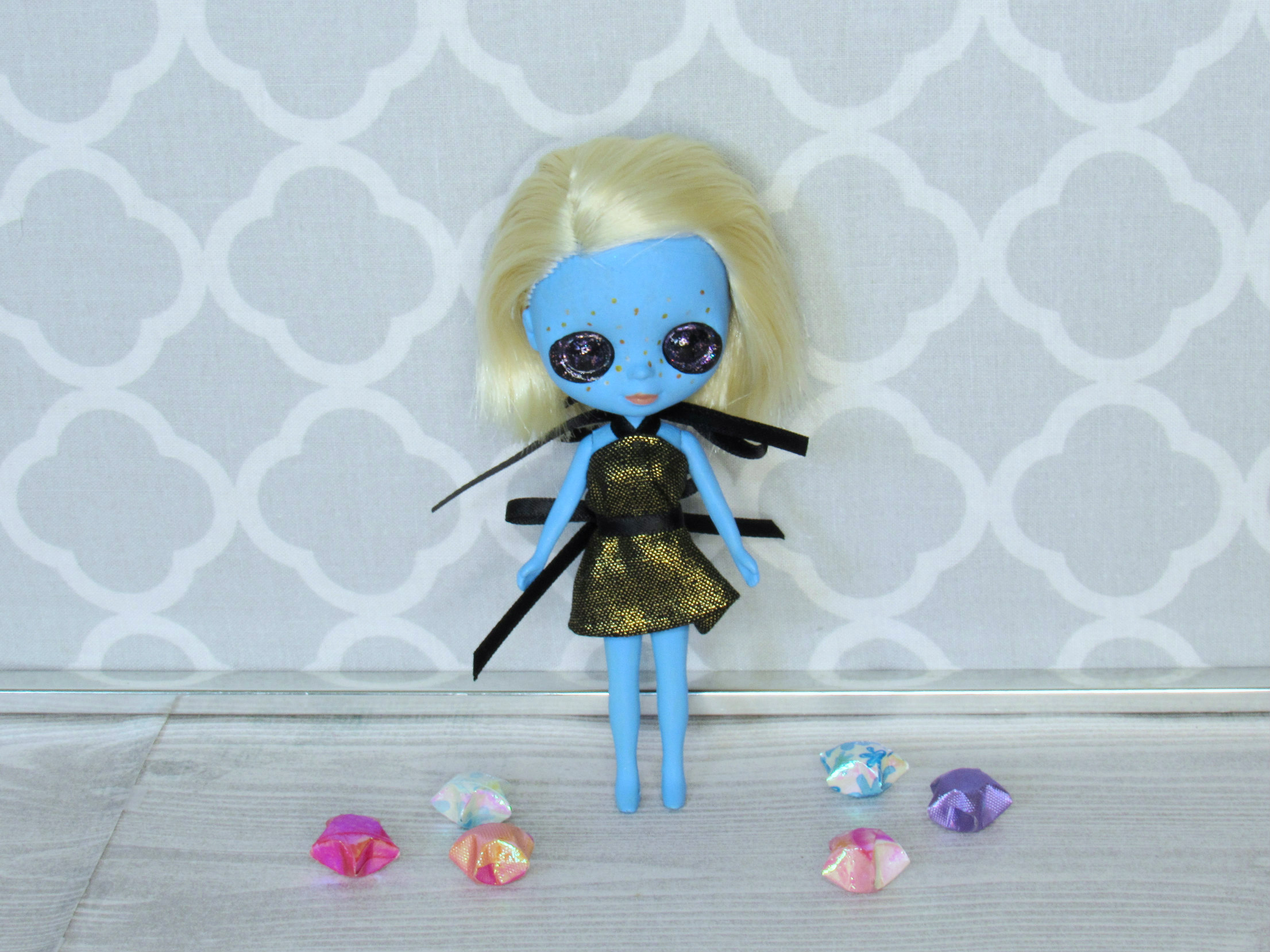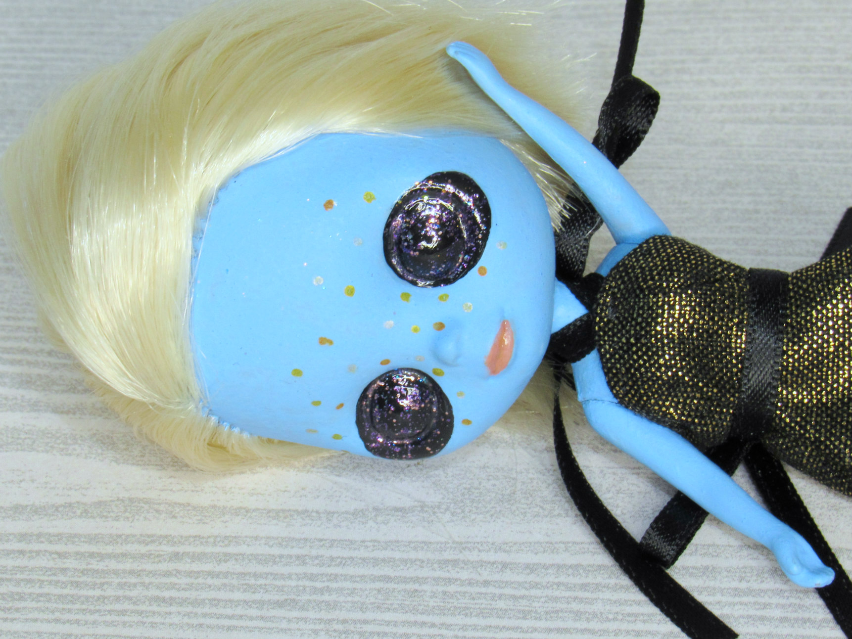 Her entire body has been painted with a custom-blended acrylic mix with embedded glitter and mica powder to give it a shimmery finish. She has metallic gold, silver, and bronze freckles across her face, and her eyes are painted with my custom galaxy glitter paints. All paints are sealed against gentle wear, but please note this doll is intended as a display piece for adult collectors and NOT as a children's toy.