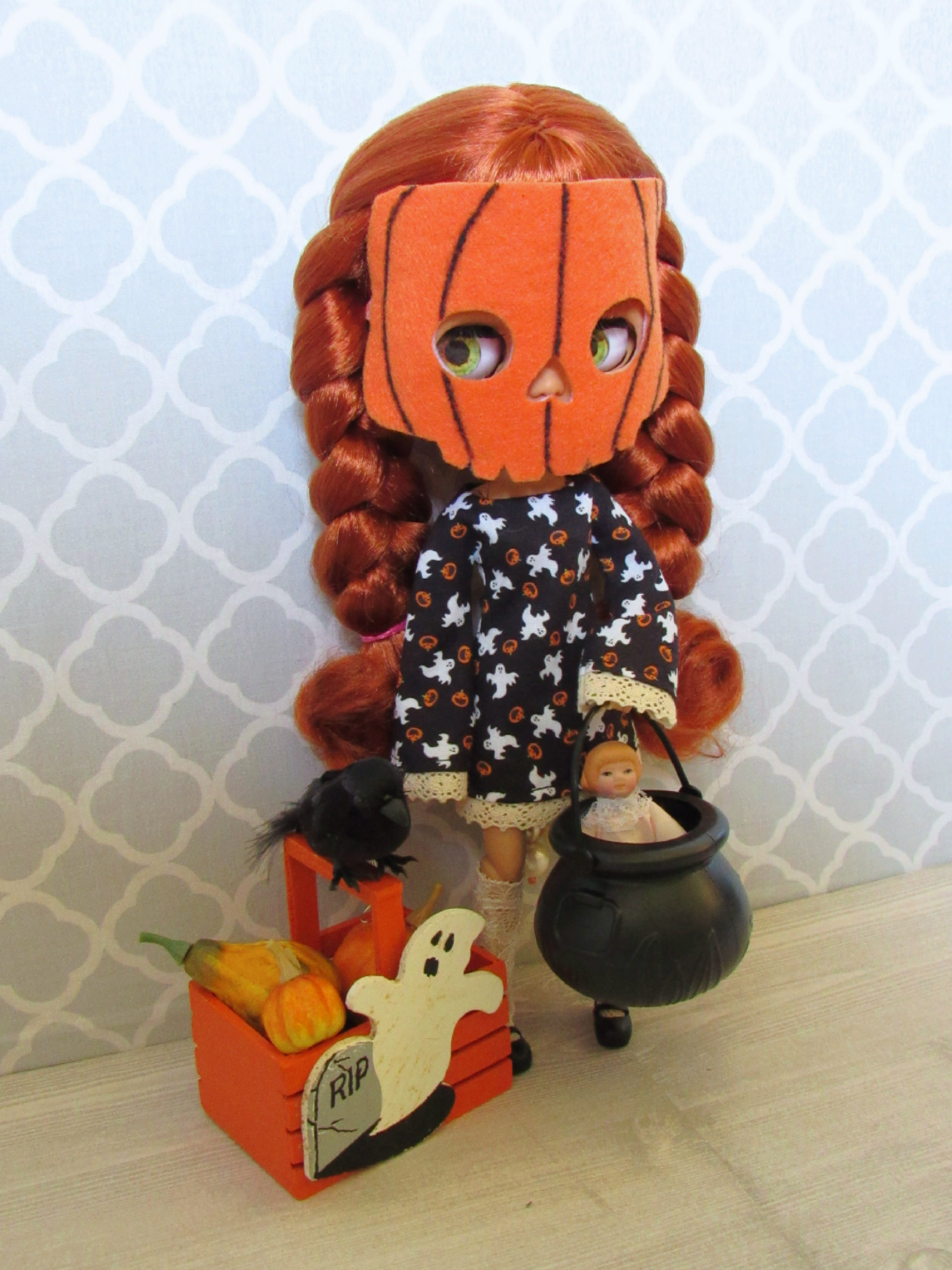 Can be purchased with the mask shown for an additional $10, or add a trick-or-treat bag with a surprise doll-sized treat inside for $5. Add both for $15.