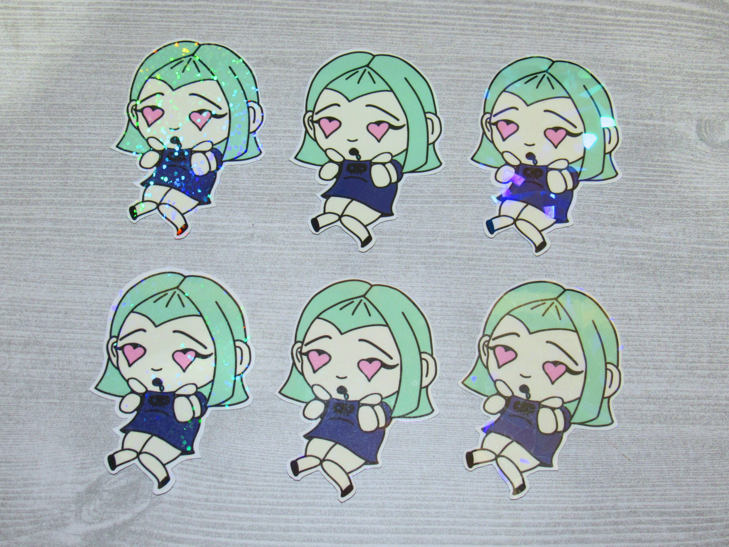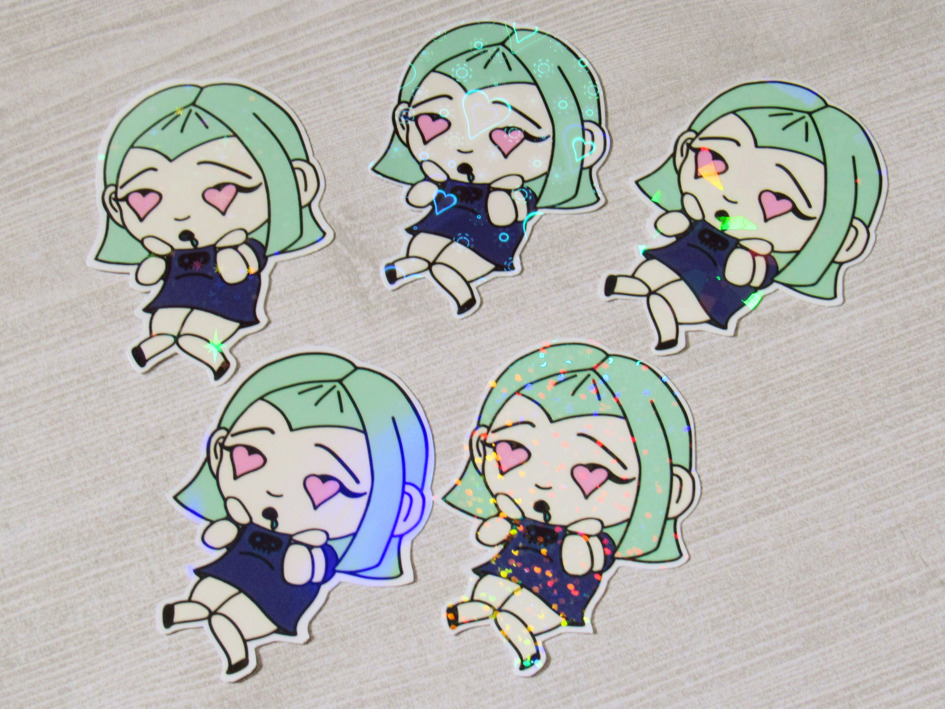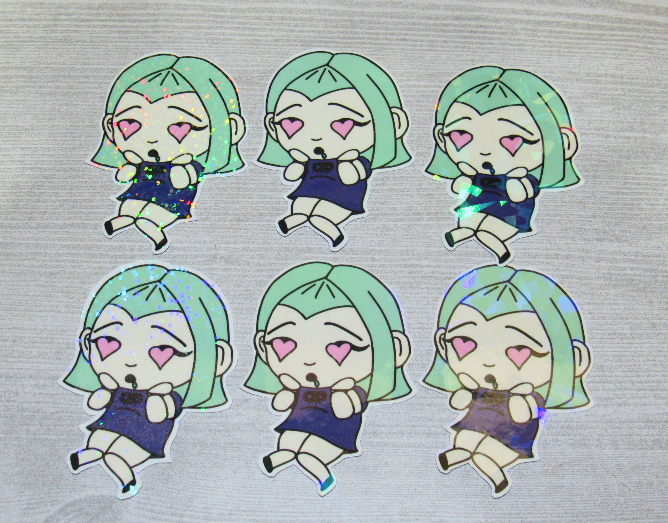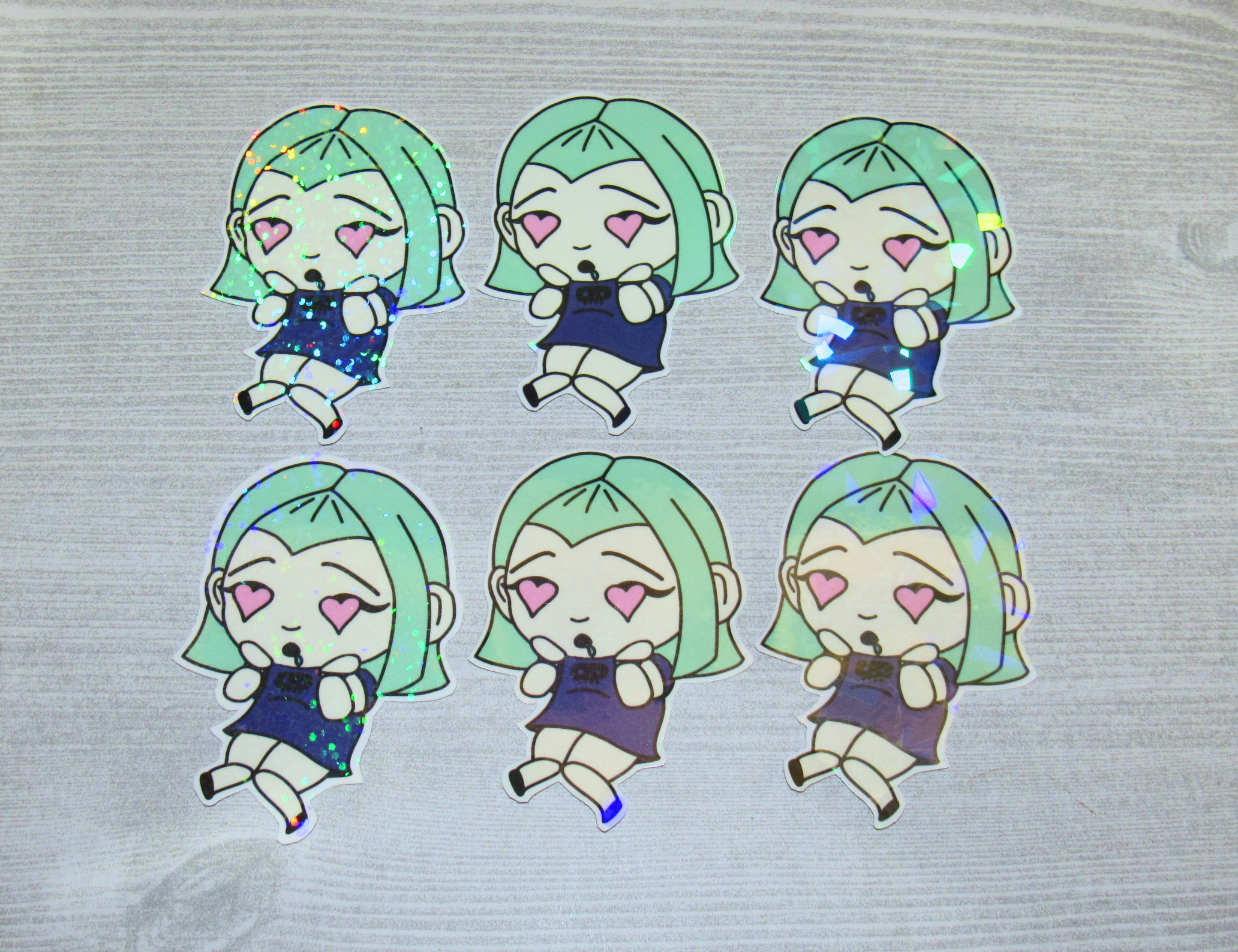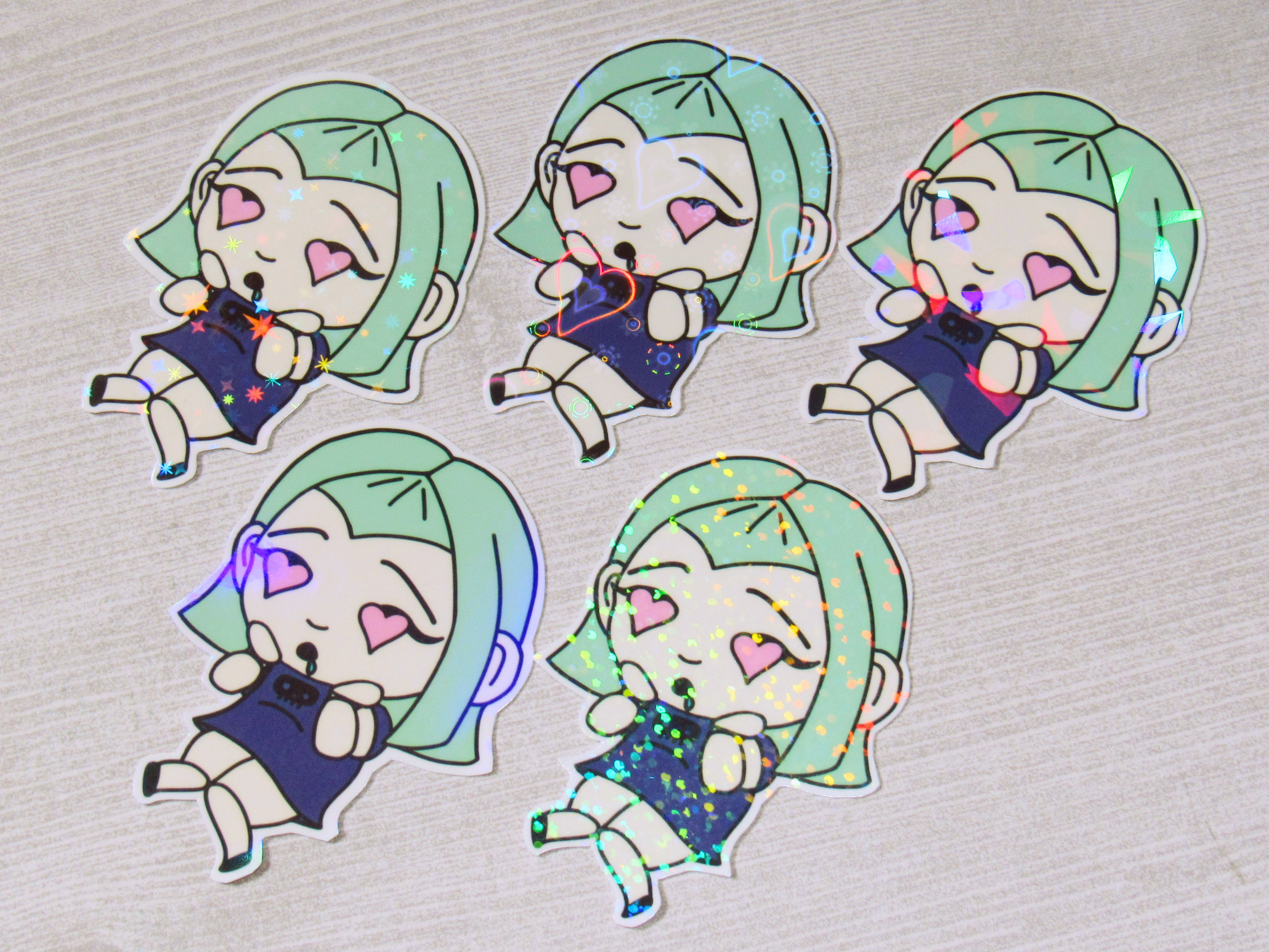 ~2.5" (~6.35cm) stickers of my SpookyDolly character, available in five different holographic finishes. Choose from glossy holo, crackle holo, or sparkle holo, hearts holo, or stars holo. The gloss finish is a subtle holo with rainbow highlights when it catches the light. Crackle is a cracked glass effect. Sparkle is the flashiest finish imo, with LOTS of rainbow glitter flashes throughout. Hearts has cute little nested hearts all over. Stars has lots of little stars and flowers. Stickers are hand cut so there may be some minor variations.