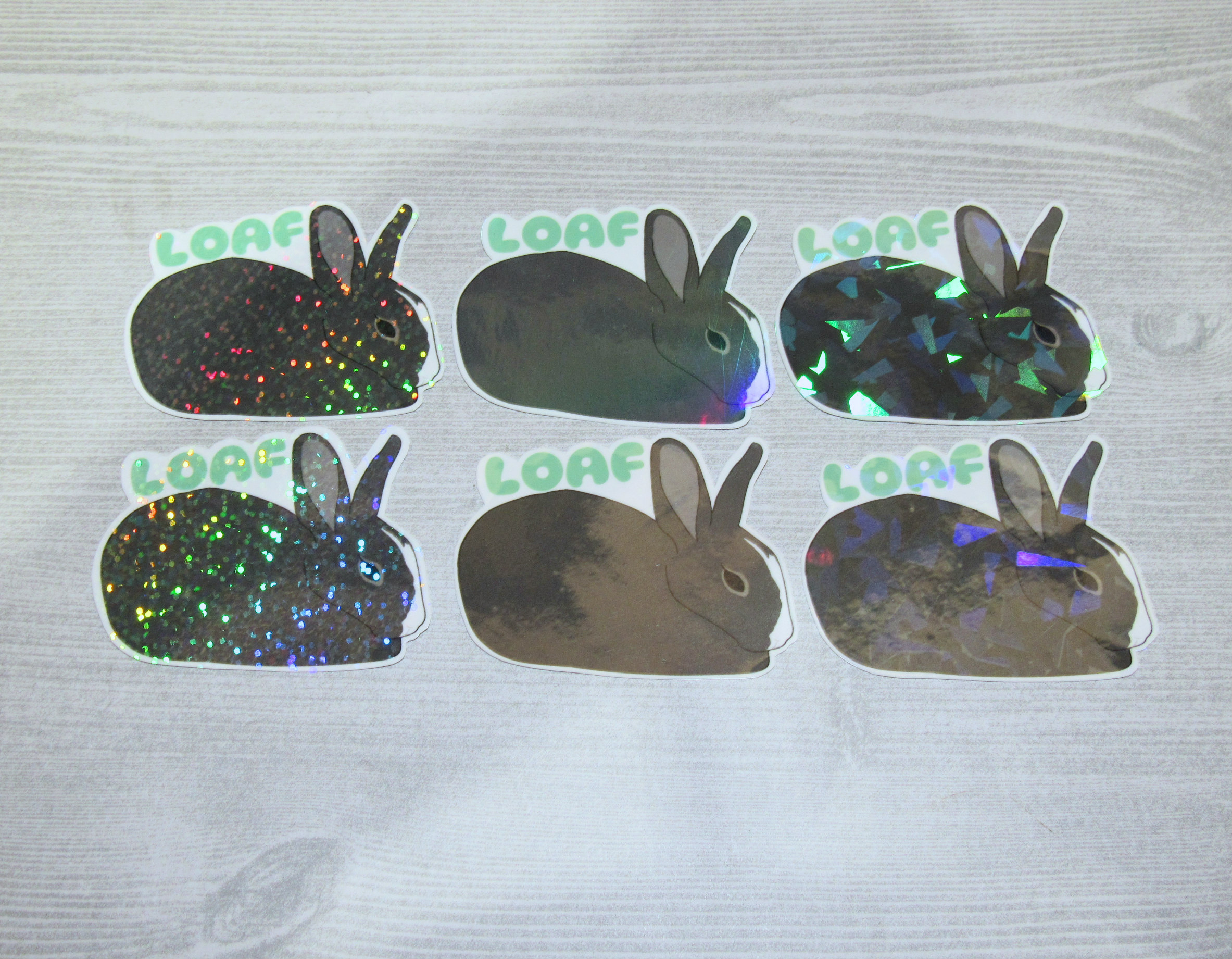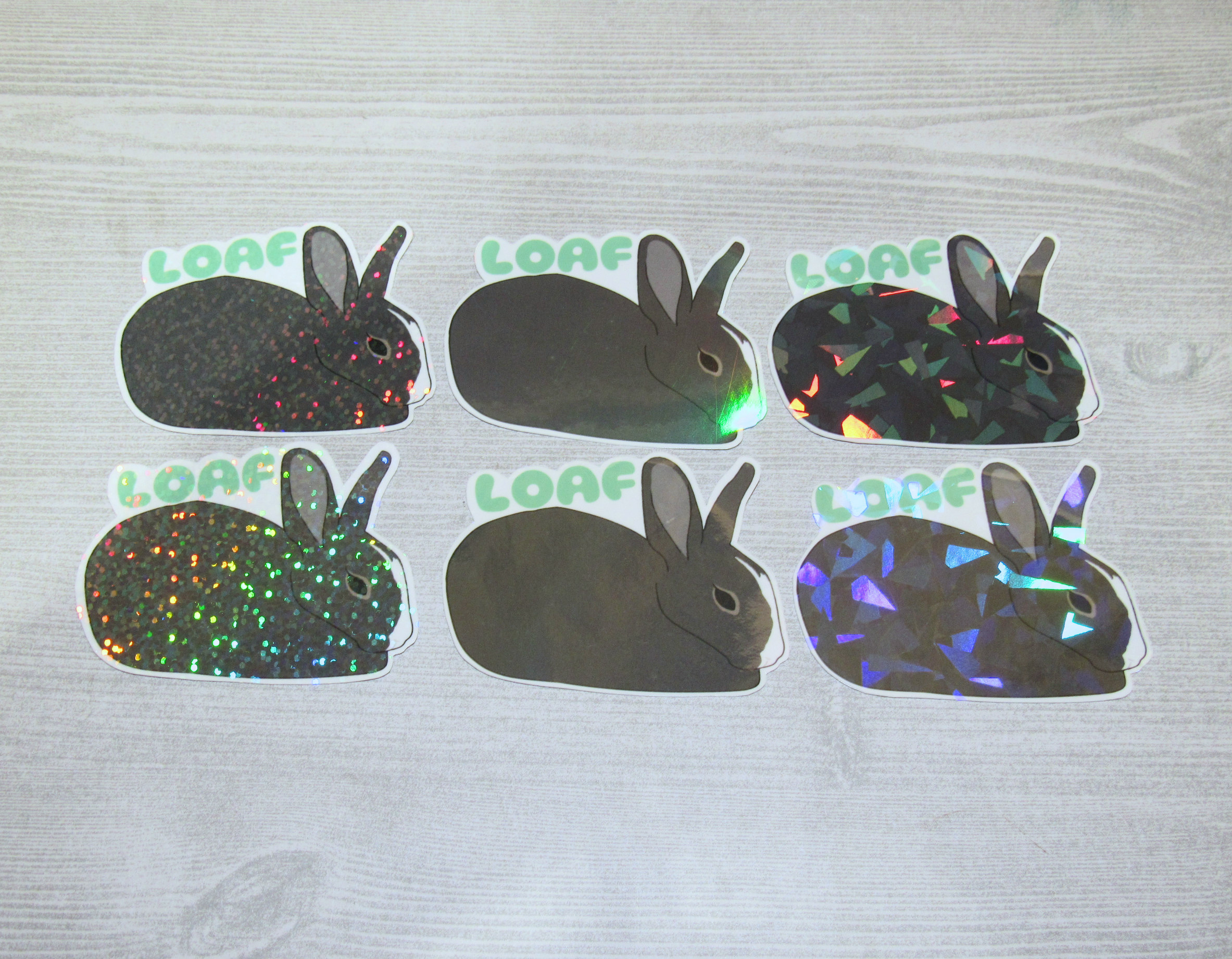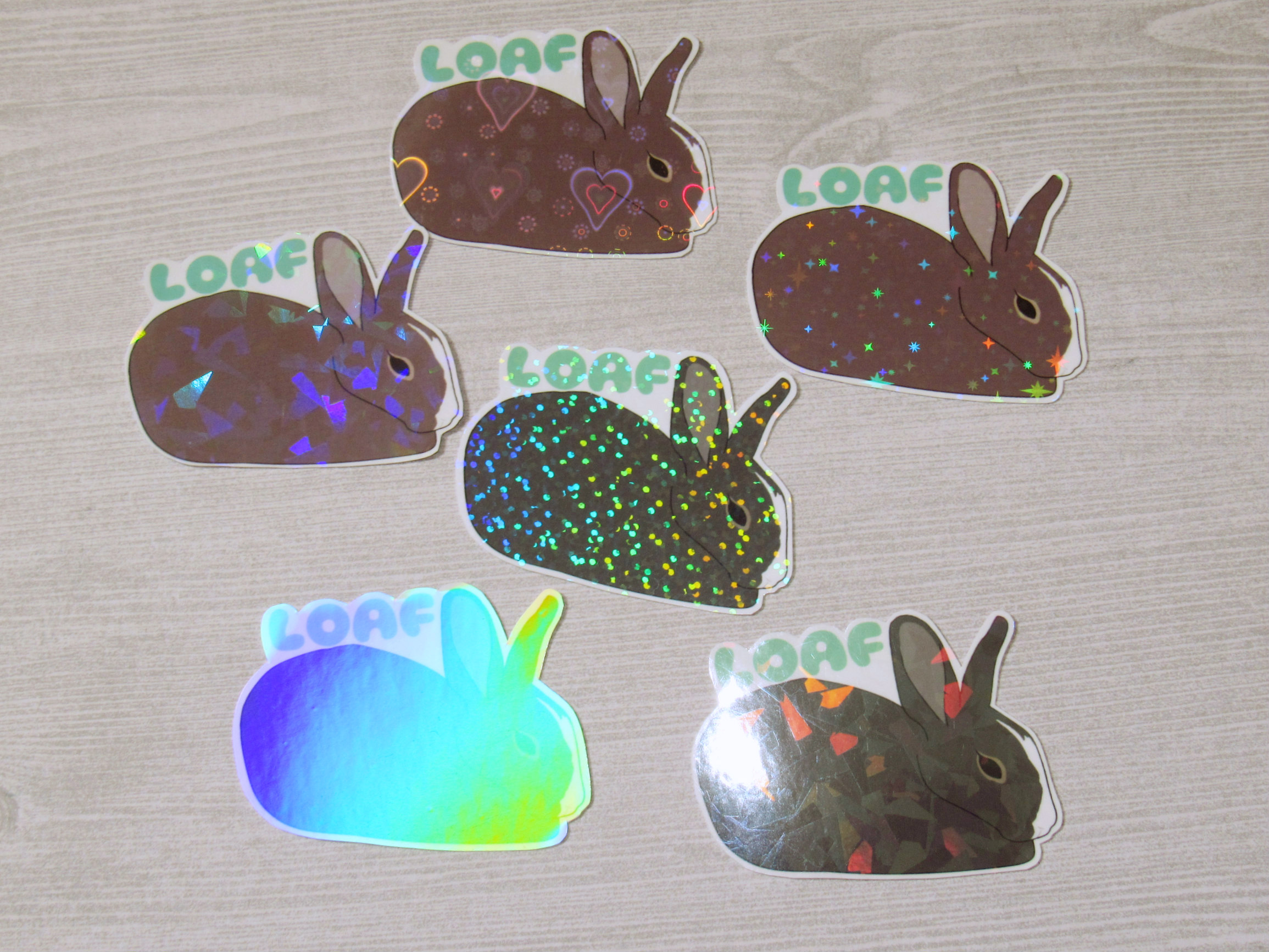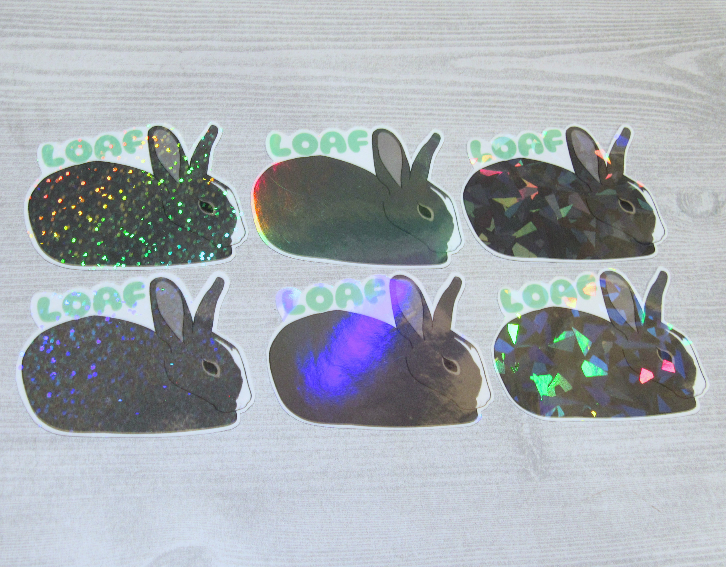 ~2.5" (~6.35cm) stickers of my little Cinnabun in loaf mode, in three different holographic finishes. Choose from glossy holo, crackle holo, or sparkle holo. The gloss finish is a subtle holo with rainbow highlights when it catches the light. Crackle is a cracked glass effect, and sparkle is the flashiest of the three imo, with LOTS of rainbow glitter flashes throughout. Stickers are hand cut so there may be some minor variations.