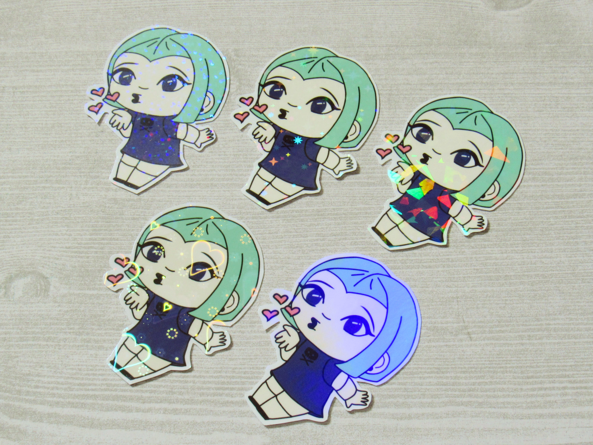 ~2.5" (~6.35cm) stickers of my SpookyDolly character, available in five different holographic finishes. Choose from glossy holo, crackle holo, or sparkle holo, hearts holo, or stars holo. The gloss finish is a subtle holo with rainbow highlights when it catches the light. Crackle is a cracked glass effect. Sparkle is the flashiest finish imo, with LOTS of rainbow glitter flashes throughout. Hearts has cute little nested hearts all over. Stars has lots of little stars and flowers. Stickers are hand cut so there may be some minor variations.