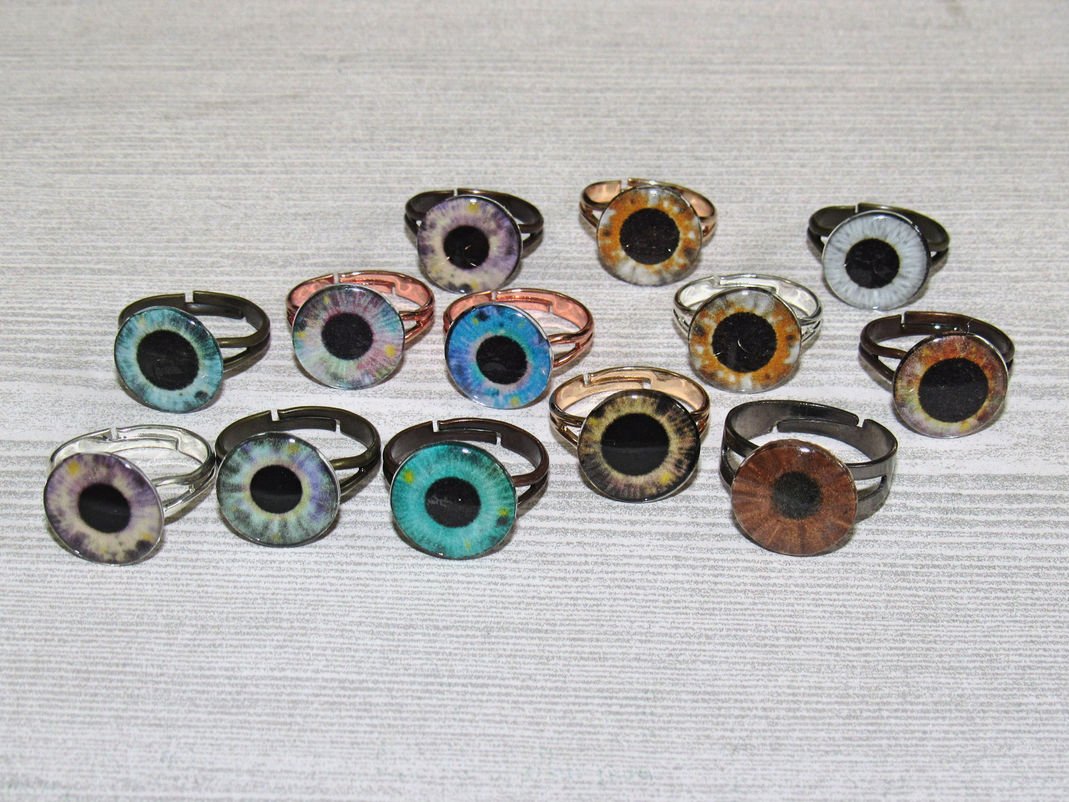 Blythe doll eye chips on adjustable nickel-free ring bases. Please state your color choice in the "notes to seller" section. These chips are B-Grade so they are NOT perfect. They have small bubbles or flaws visible up close, but not clearly visible from a reasonable distance, which is why they are being sold at a discount. All sales are final on these rings, so please purchase carefully. No returns will be accepted.