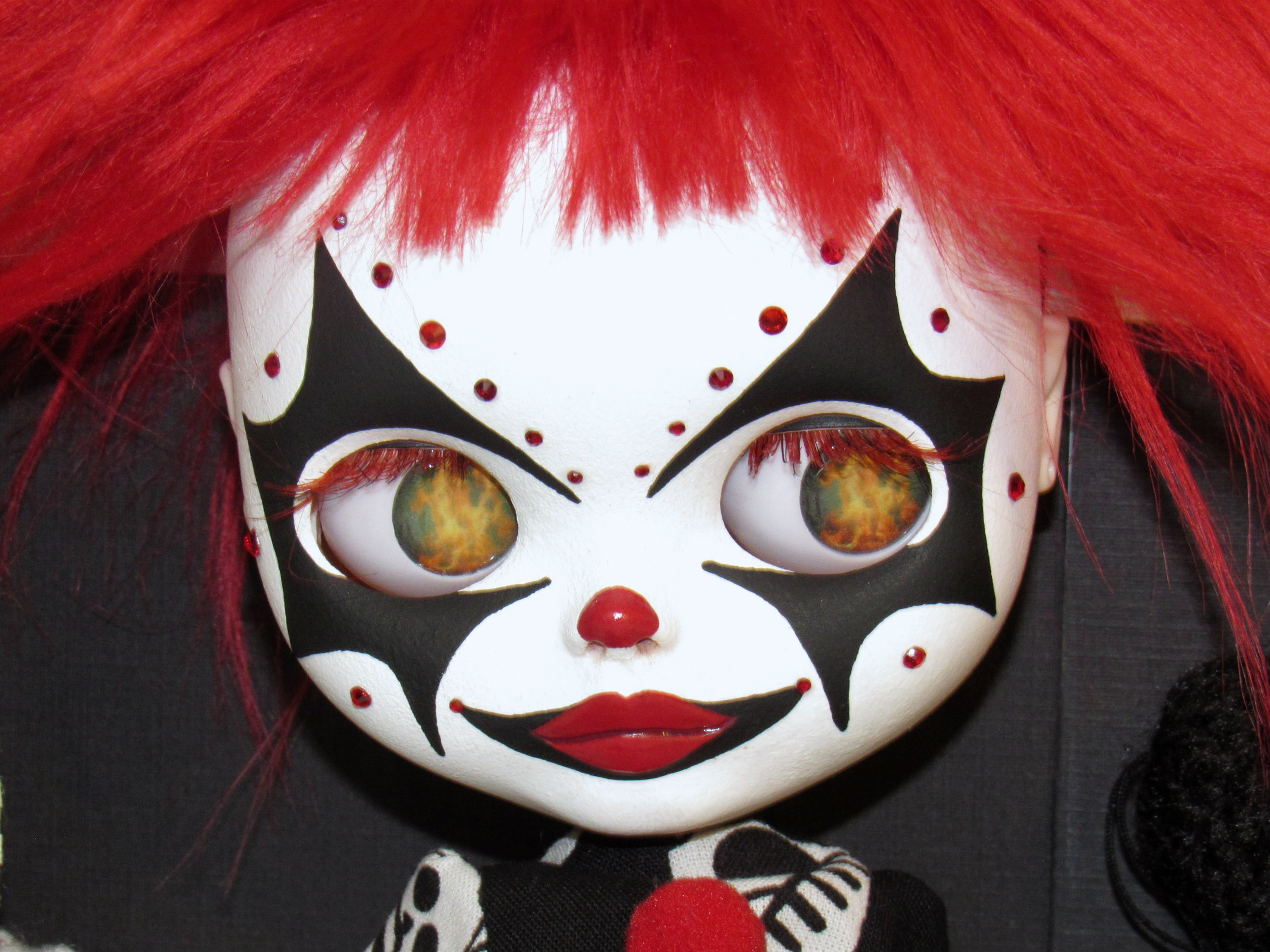 Fake base doll with custom carving and painting. Azone type body. Custom handmade faux fur wig glued with E6000 so it won't slide around. 4 sets of handmade custom eye chips including a custom red glitter resin pair. Gaze corrected and boggled, sleep eyes added with two custom pull strings. She will come in her complete outfit including custom made clown suit, red polka dot boots, and cone hat. I will also include 3 extra pairs of hands including a pair of grippy hands so she can hold her bloody knife.