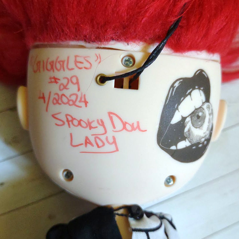 All Blythe dolls in my shop come with a plushie friend to keep them company on their travels. Giggles will ship with a voodoo doll mini Blockhead.