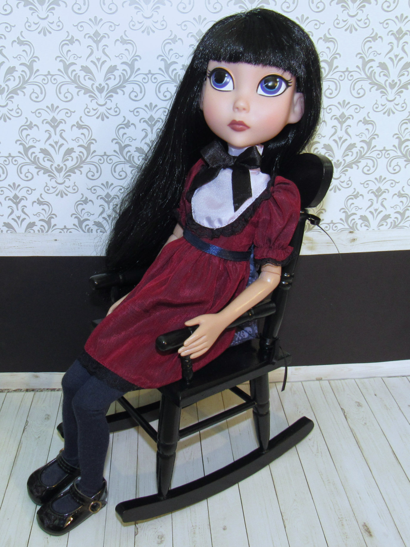 Approx. 1:4 scale doll size rocking chair. Hand painted and sealed with glossy varnish, with 2 custom made cushions. Fits my 16" Maudlynne Macabre doll perfectly. Looks a little large with Blythe or 1:6 scale dolls, so I'm guessing it's 1:4 scale.