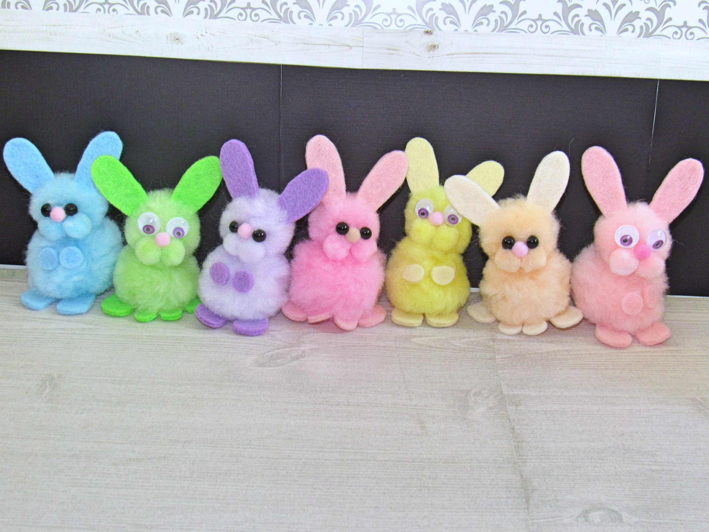 Super fluffy pompom bunnies with felt paws and ears and plastic or googly eyes. ~3" tall from toes to ears.