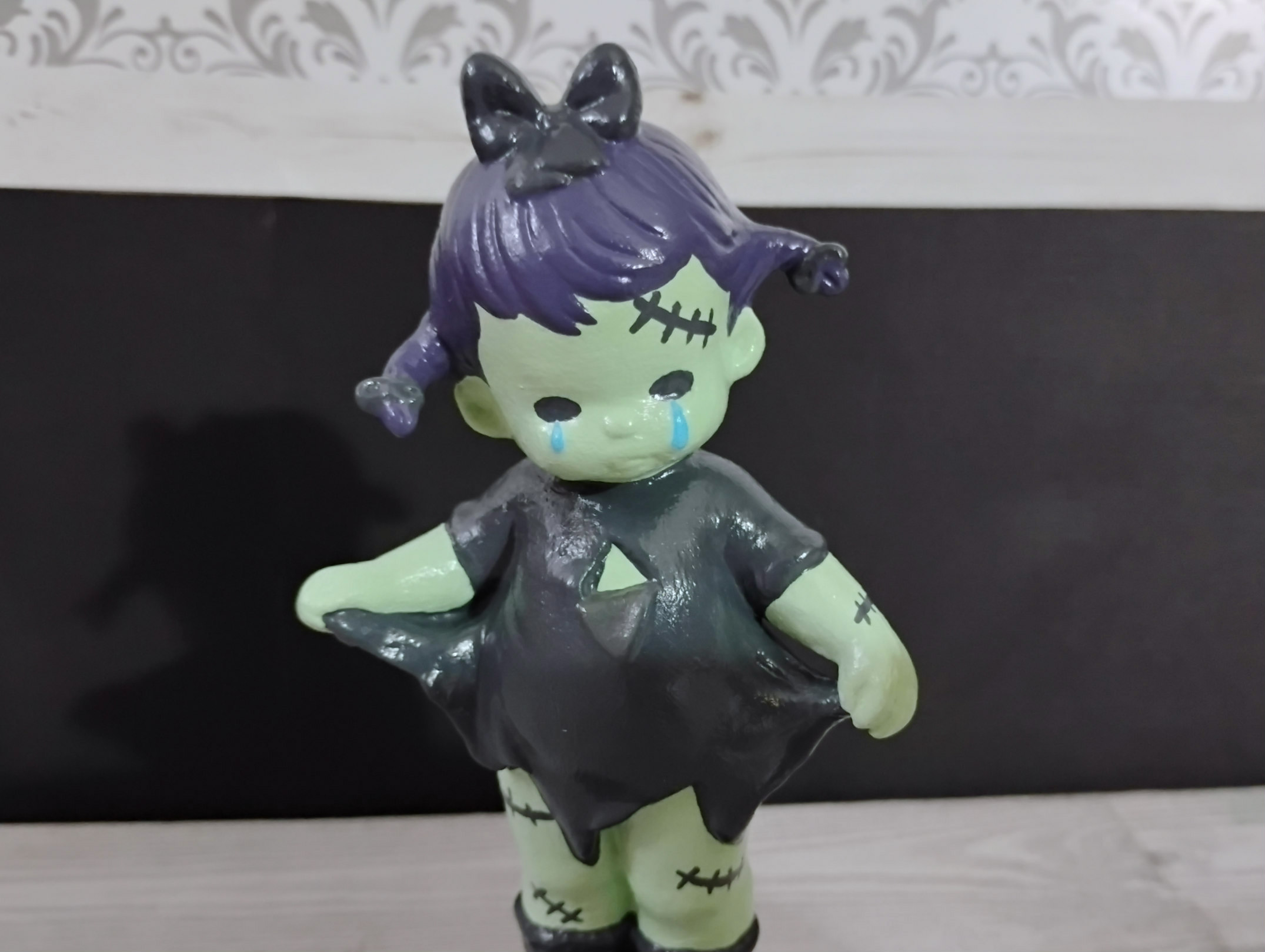 vintage ceramic figurine repainted as a little frankenstein girl. will ship USPS Priority with insurance packed as carefully as I can. If you'd like to pay for a shipping upgrade to UPS or FedEx please send me a message first and let me know so I can adjust the price to cover the difference.